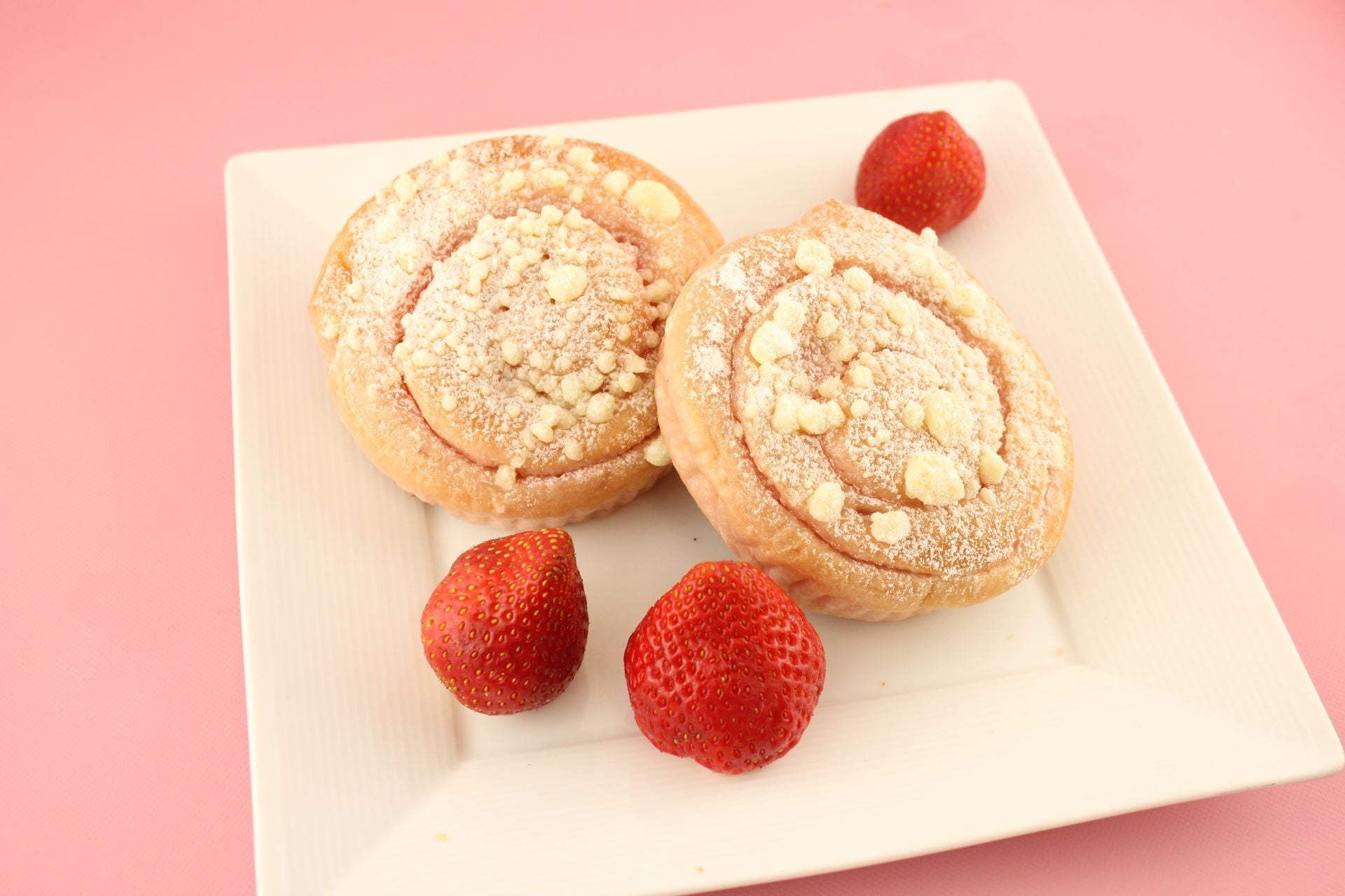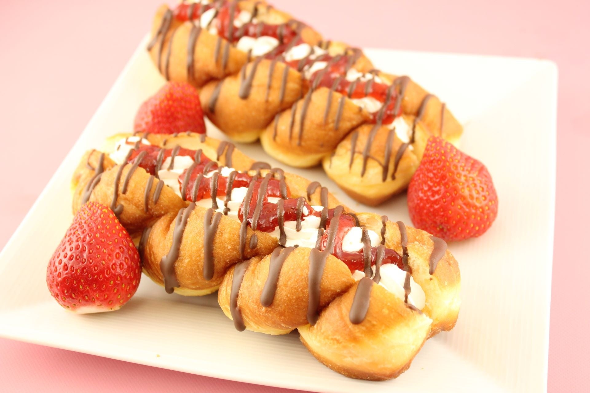 デニッシュにいちごジャムとホイップクリームをサンドし、ストロベリー風味のチョコをコーティングしました。