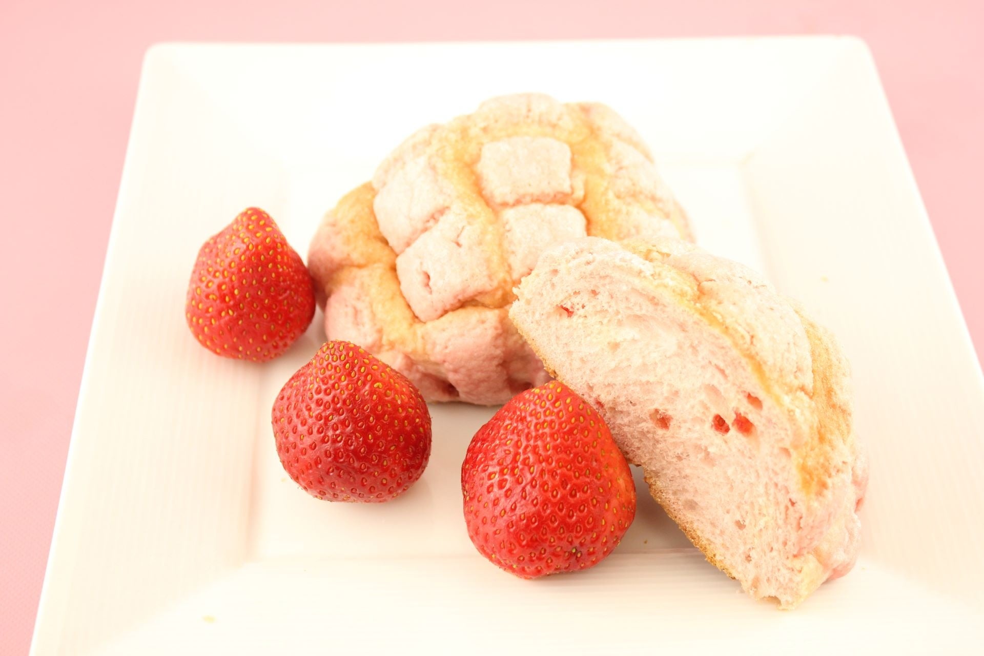 イチゴ顆粒を練り込んだソフトな食感の生地に、いちご風味のクッキー生地をかぶせてふんわりと焼き上げました。