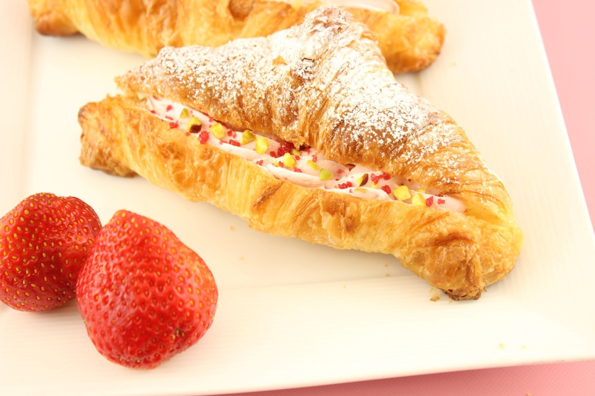 フランス・ブルターニュ産の発酵バターとロレーヌ地方産岩塩入りのマーガリンを折り込んで焼き上げたクロワッサンに、苺ホイップをサンドしました。