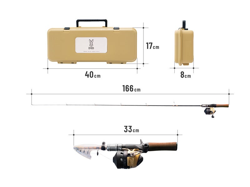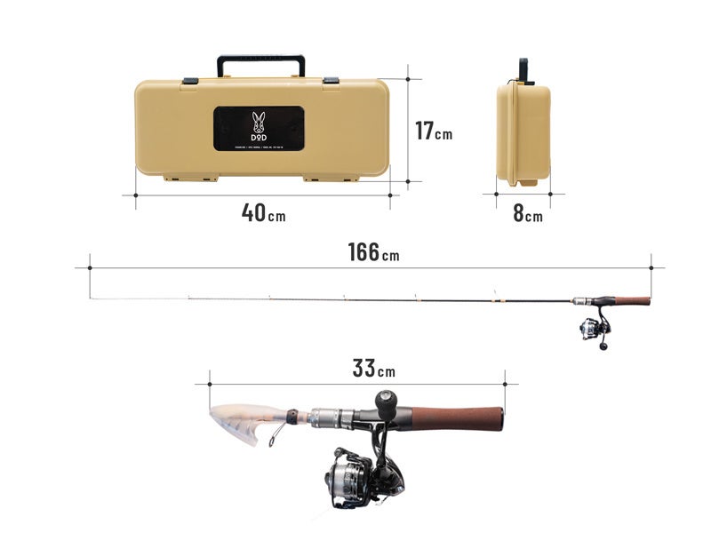 製品名:釣りボックス(やさしい) 型番・カラー:FG1-150-TN・タン 販売価格(税込):10,000 円 詳細ページ:https://www.dod.camp/product/fg1-150-tn/ サイズ: ロッド全長 166cm 収納サイズ: ・ロッド収納長 (約)33cm 重量: ・総重量 (約)820g ・ロッド重量(保護カバーを除く)(約)72g ・リール重量(ラインを含む)(約)158g 材質: ・ボックス ABS セット内容: ボックス、ロッド(竿)、ロッドカバー(ロッドに取付済み)、リール(ロッドに取付済み)、ライン(糸)ナイロン2号100m(リールに巻付済み)、スナップ付きサルカン✕5(うち1点はラインに取付済み)、にんじん仕掛け(2個セット)、おだんご仕掛け(2個セット)、仕掛け用ケース その他特徴: リール最大ドラグ力 4.7kg |
