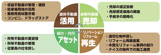 遊休不動産の活用、余剰不動産の売却、所有不動産の賃貸管理等を検討されている販売店様や工務店様と、当社と取引のあるゼネコン様、設計事務所様、不動産会社様をマッチングすることで、事業用地情報や建築ニーズ情報を中心に最適なソリューションをご提供いたします。
