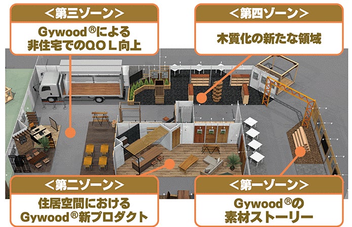 国産針葉樹の表層部を特に高密度化したオリジナル木材商品「Gywood®」を使用したプロダクトをご紹介します。Gywood®が開発された背景や製造過程をご紹介し、素材ブランドとしての魅力をお伝えするほか、家具やキッチンなどの住居空間における新商品、オフィスや教育施設などの非住宅における木質空間提案、筆記具やトラックの荷台といった非建築分野での木材利用など、活用シーン別にGywood®を用いた様々な商品を展示いたします。