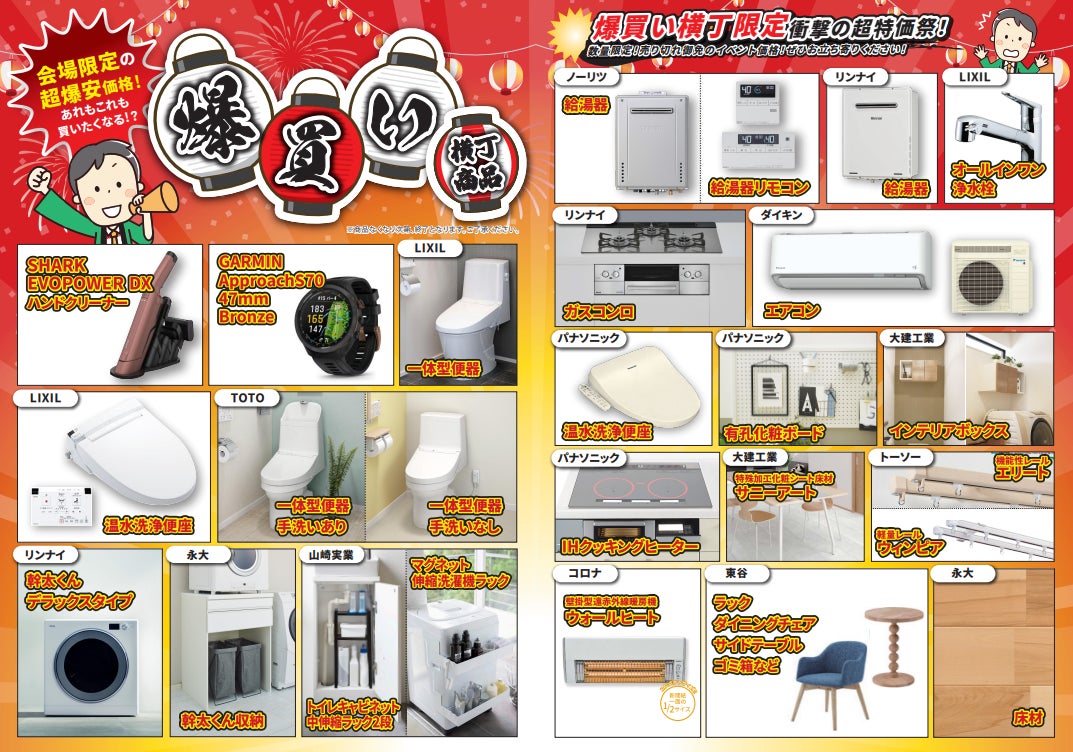 当日限定の特別価格で建材・住宅設備を販売する「超大特価祭」を開催し、温水洗浄便座、ガス衣類乾燥機、給湯器、エアコンといった商品を各メーカー様にご提供いただきます。また、当社グループのプライベートブランド「ZENIYA®」が展開する基礎資材、副資材をはじめ、建築構造との一体化に特化した間接照明ユニットや、高い止水性を有するルーフィング(防水シート)等の新商品を展示いたします。