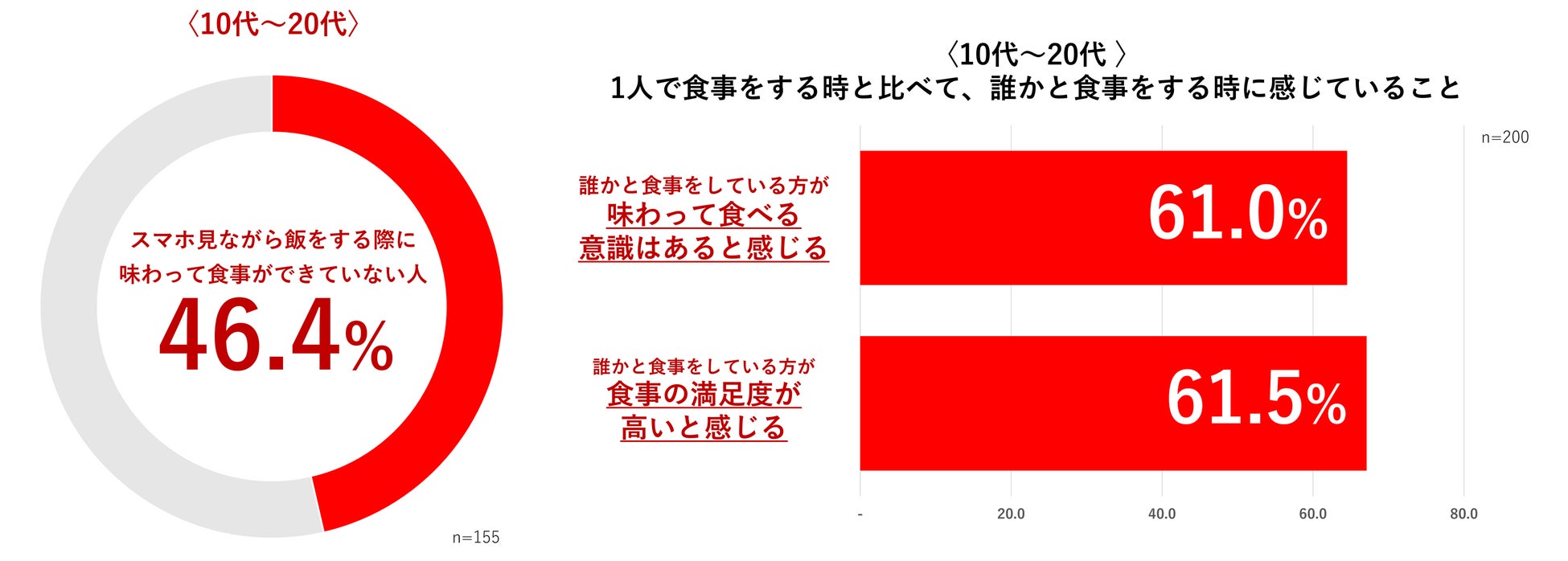 10~20代の「スマホ見ながら飯」をしている人に向けて、「味わって食事ができているか」と質問すると、46.4%が「味わって食事ができていない」と回答しました。また、10〜20代に「スマホ見ながら飯」をしている環境について聞くと、84.5%の人が週に4日以上一人で夕食をとっていることが分かりました。この結果からも食事の環境が「スマホ見ながら飯」の習慣化につながる要因になっている可能性が考えられます。一方、誰かと食事する場面について聞くと、61.0%が「一人の時に比べて誰かと食事をしている方が味わって食べる意識はある」と答えました。また、誰かと食事をしているときの満足度についての質問では「一人の時に比べて食事の満足度が高いと感じる」と答えた人が61.5%になり、一人のときより、誰かと食事をしているときの方が、食事をおいしく食べていると感じる人が多いことが明らかになりました。