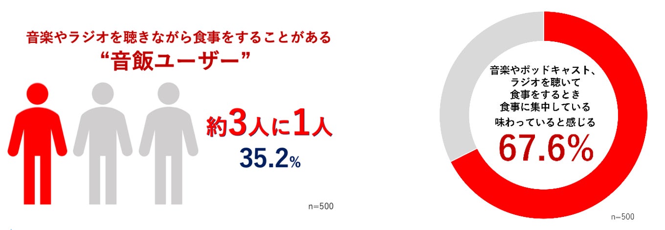 そのうち、「音楽やポッドキャスト、ラジオを聴いて食事をするときは食事に集中している・味わっていると感じる」と回答した人が67.6%となり、音楽やラジオを聴きながら食べる「音飯」は、「スマホ見ながら飯」より健康的な食習慣につながると考えられます。