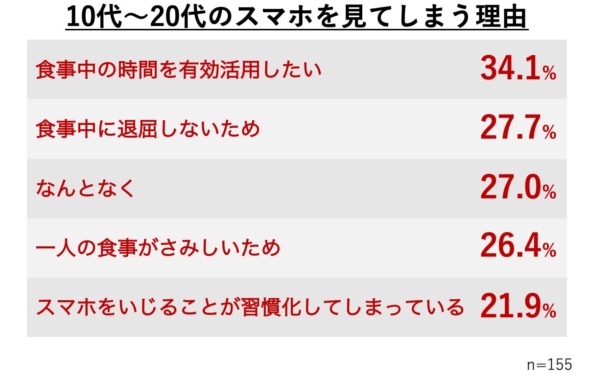 また、「スマホ見ながら飯」をしたことがある10〜20代に対して理由を聞くと、約4人に1人が「一人の食事がさみしい」、約5人に1人が「スマホをいじることが習慣化してしまっている」と回答。また34.1%が「食事中の時間を有効活用したい」と答えました。10〜20代は食事の時間にもスマホが手放せなくなっていると考えられます。