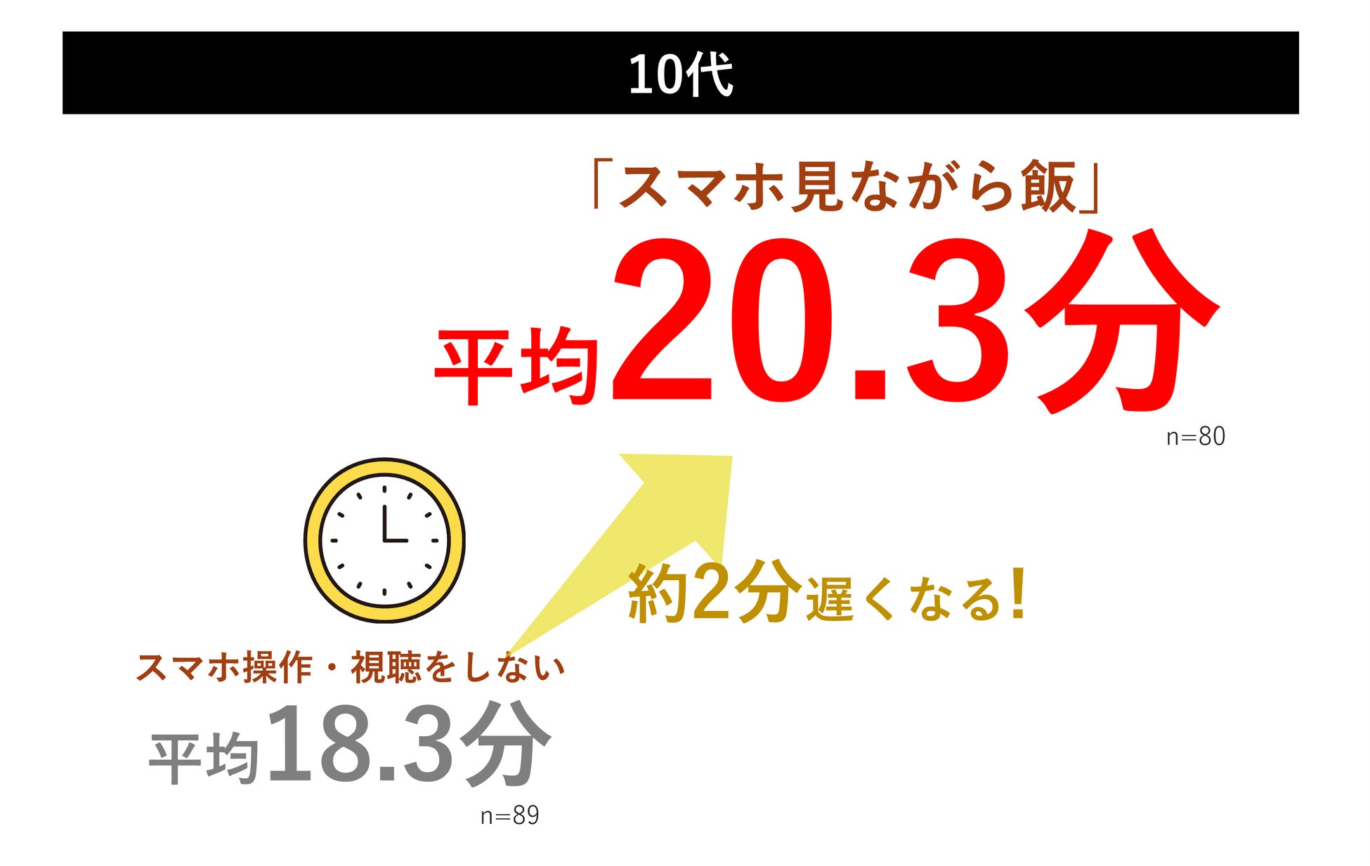 スマホの操作・視聴を一切していない時の食事の平均時間と、「スマホ見ながら飯」の平均時間で、最も回答の多かった時間を比較した結果、10~20代は「スマホ見ながら飯」で食事スピードが遅くなることが明らかになりました。スマホの操作・視聴を一切していない時は10代が平均18.3分、20代が15.5分だったのに対して、「スマホ見ながら飯」では10代が20.3分、20代が20.6分となり、スマホの操作・視聴を一切していない食事よりも、「スマホ見ながら飯」の方が10代では約2分、20代では約5分長くなっていることが明らかになりました。