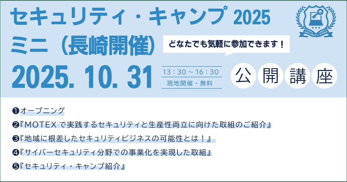 長崎県、一般社団法人セキュリティ・キャンプ協議会が主催する「セキュリティ・キャンプ2025ミニ(長崎開催)」の公開講座を2025年10月31日(金)に開催いたします。