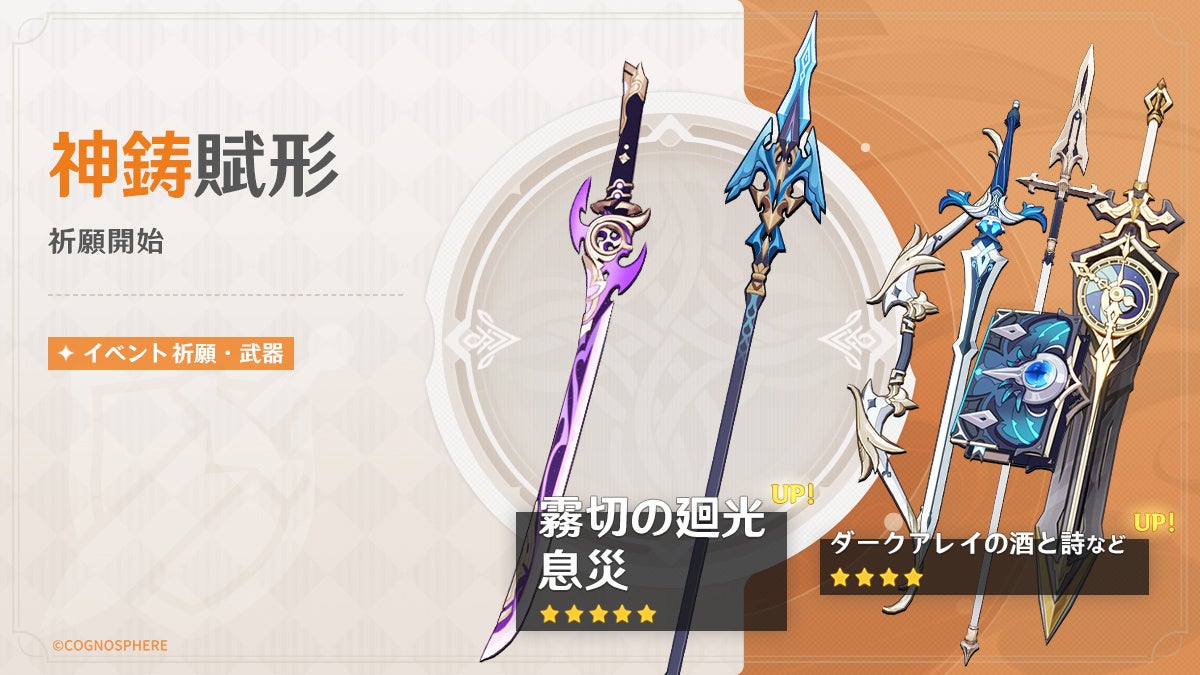 期間中、限定★5武器「長柄武器・息災」「片手剣・霧切の廻光」などの出現率が大幅にUPします。