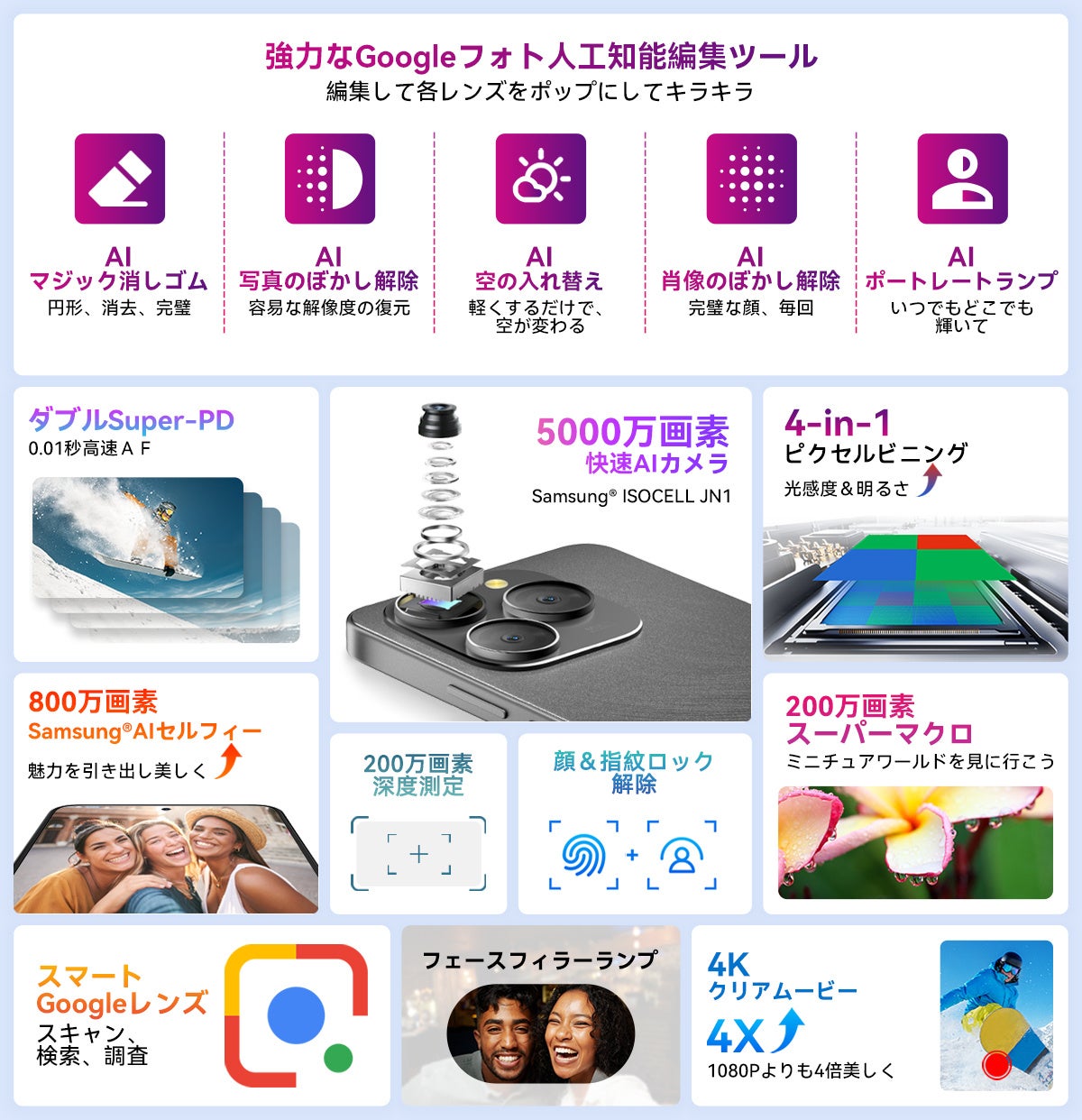 前面には8MPフロントカメラを搭載。背面には50MPメイン+2MPマクロ+2MP深度の3眼構成カメラを搭載しており、高度なAI機能を活用することで、あらゆるシーンで高品質な写真撮影を楽しめます。