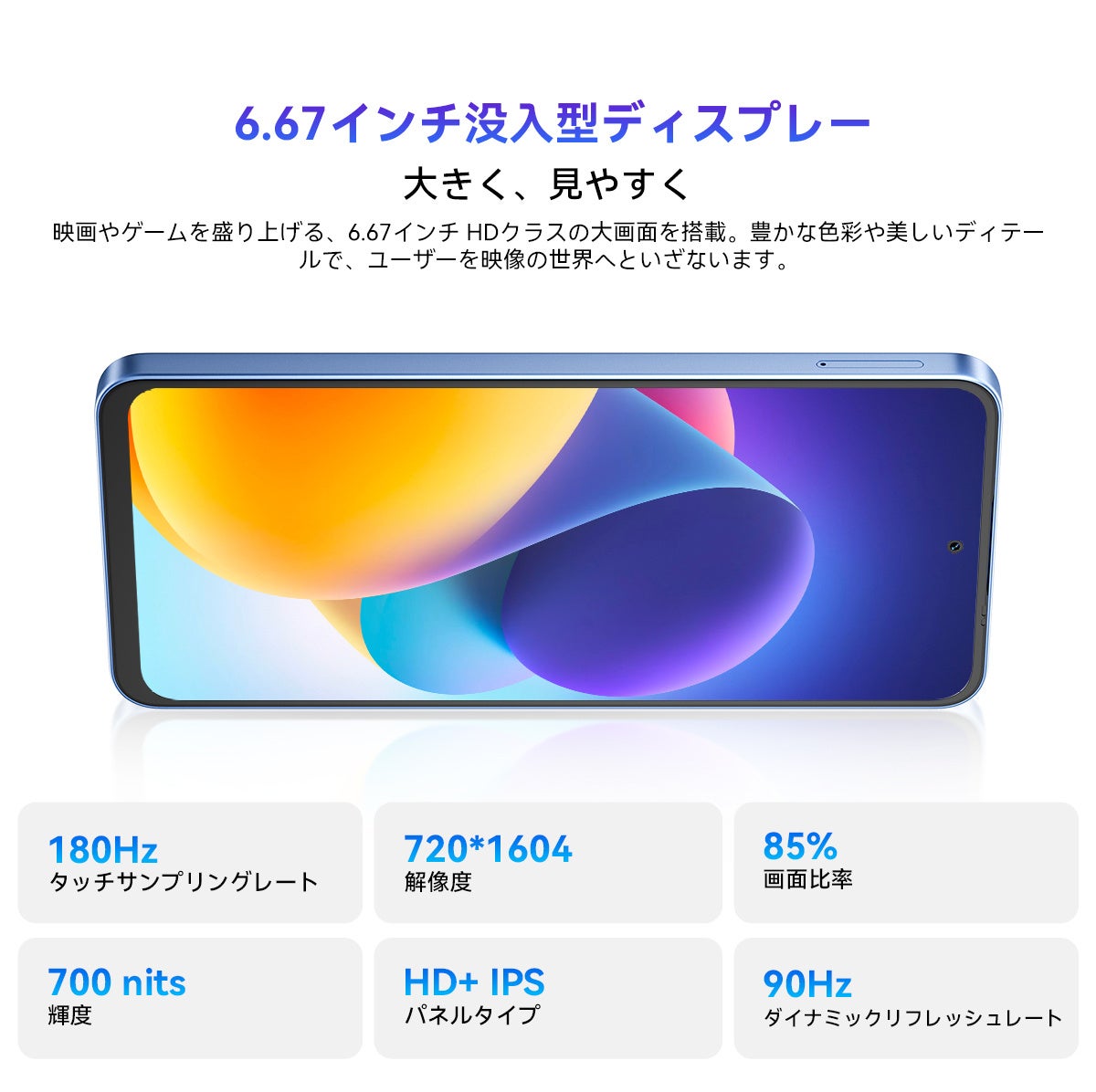 6.67インチ IPS/HD+/90Hz/Android14/Unisoc T820/24GB+256GB/5G対応/50MPメイン+2MPマクロ+2MP深度の3眼構成リアカメラ/18W急速充電対応/