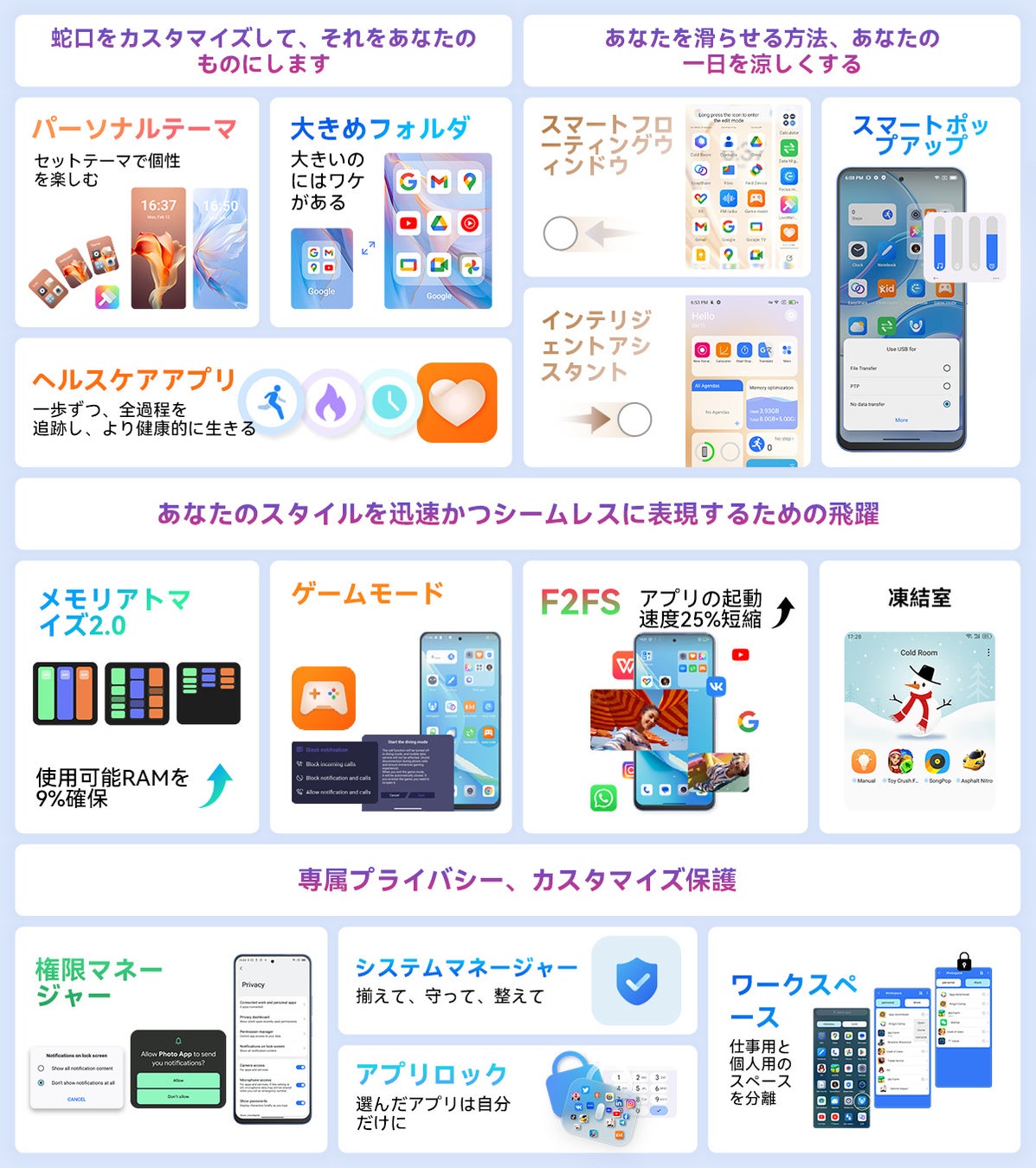 そしてAndroid 14ベースの独自OS「Doke OS 4.0」には、スマホの利便性とセキュリティ保護を向上させるバリエーション豊かな便利機能が用意。自身の目的に応じて機能を最適化することで、高度にパーソナライズされたスマホ利用体験を楽しめます。