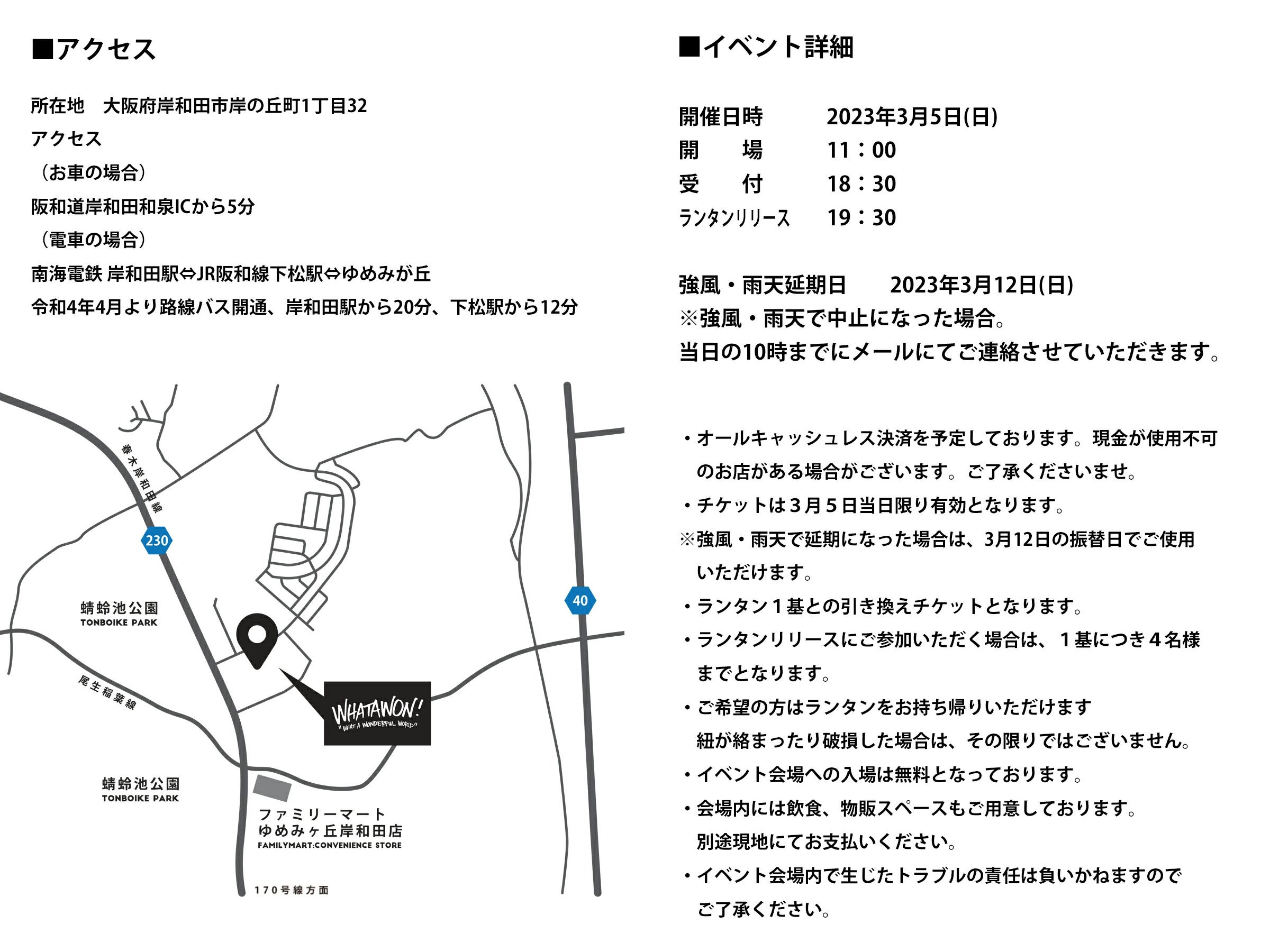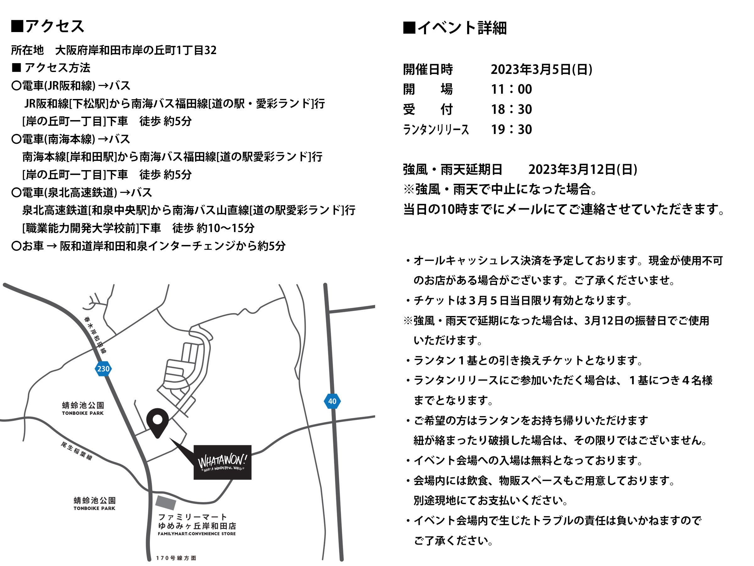 強風・雨天延期日:2023年3月12日(日) 開場 11:00 / 受付 18:30 / ランタンリリース 19:30