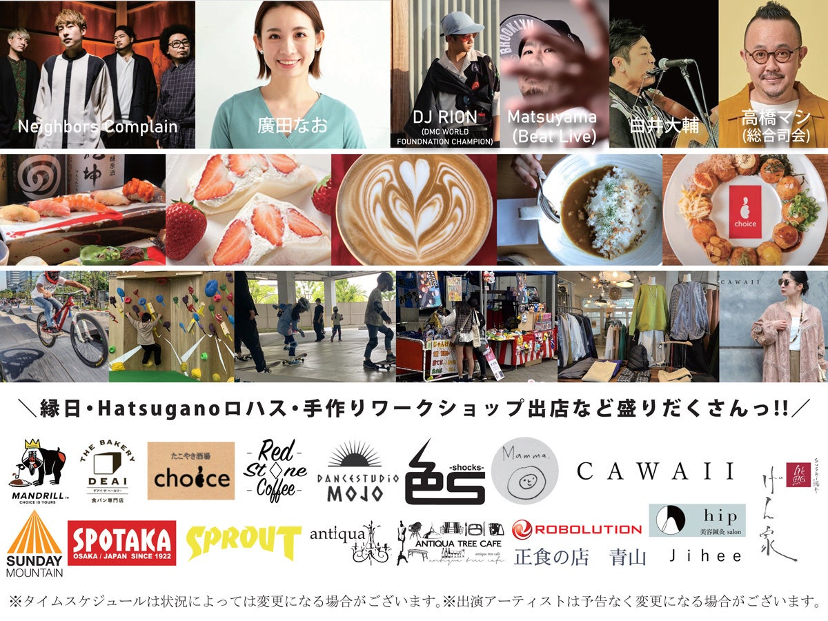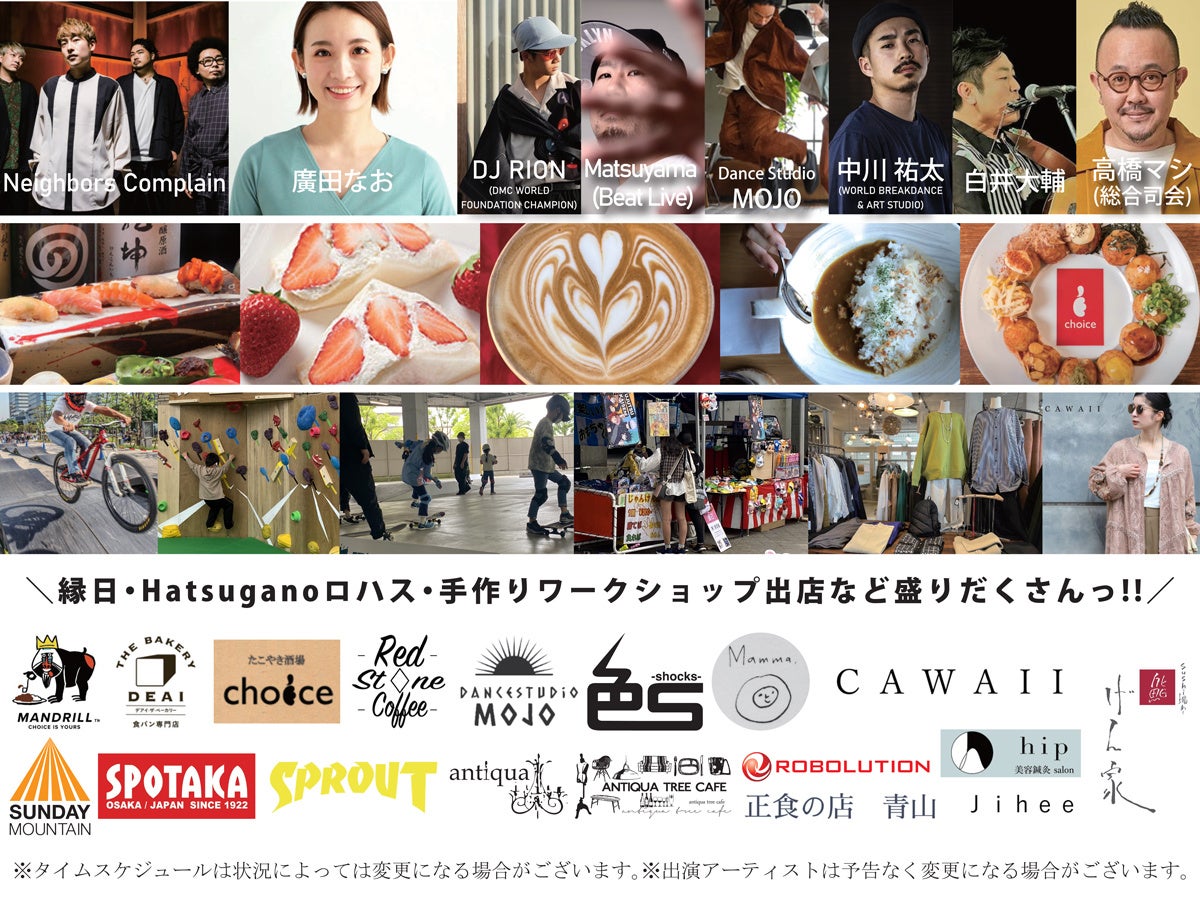 イベント会場自体への入場は無料。ブラックミュージックをルーツとする大阪発の4人組バンド「Neighbors Complain」のライブのほか、「美筋ヨガ」の考案者・ヨガインストラクターの廣田なおさんによるヨガレッスン、シンガーソングライターの白井大輔さんや、ダンスパフォーマンスなど、さまざまなエンターテインメントがお楽しみいただけます。