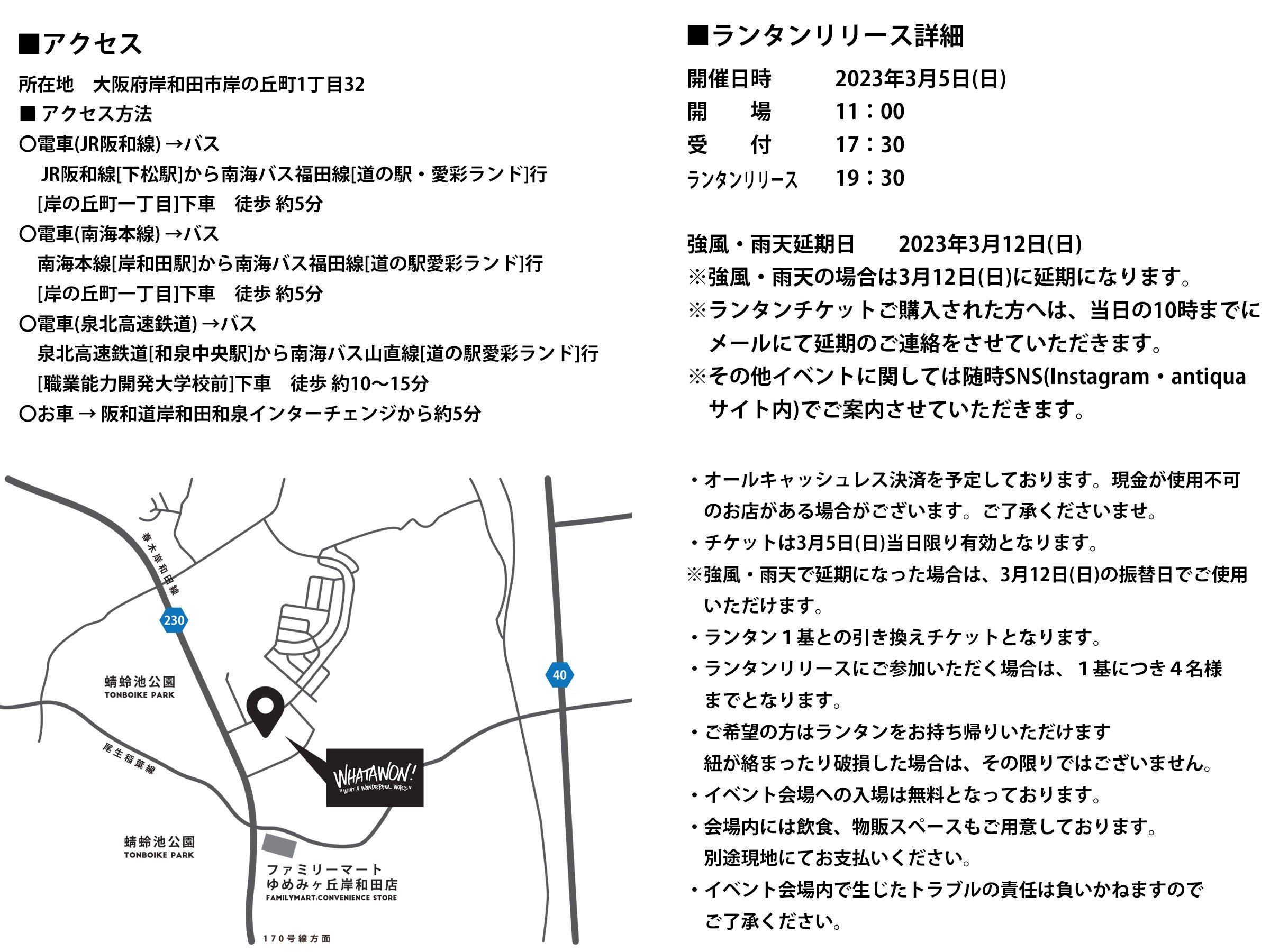 株式会社antiquaは3月5日(日)、来春大阪・岸和田に複合施設「WHATAWON(ワタワン)」建設予定地にて、岸和田の夜空にランタンが舞うランタンイベント「WHATAWONランタンフェスタ」を開催いたします。