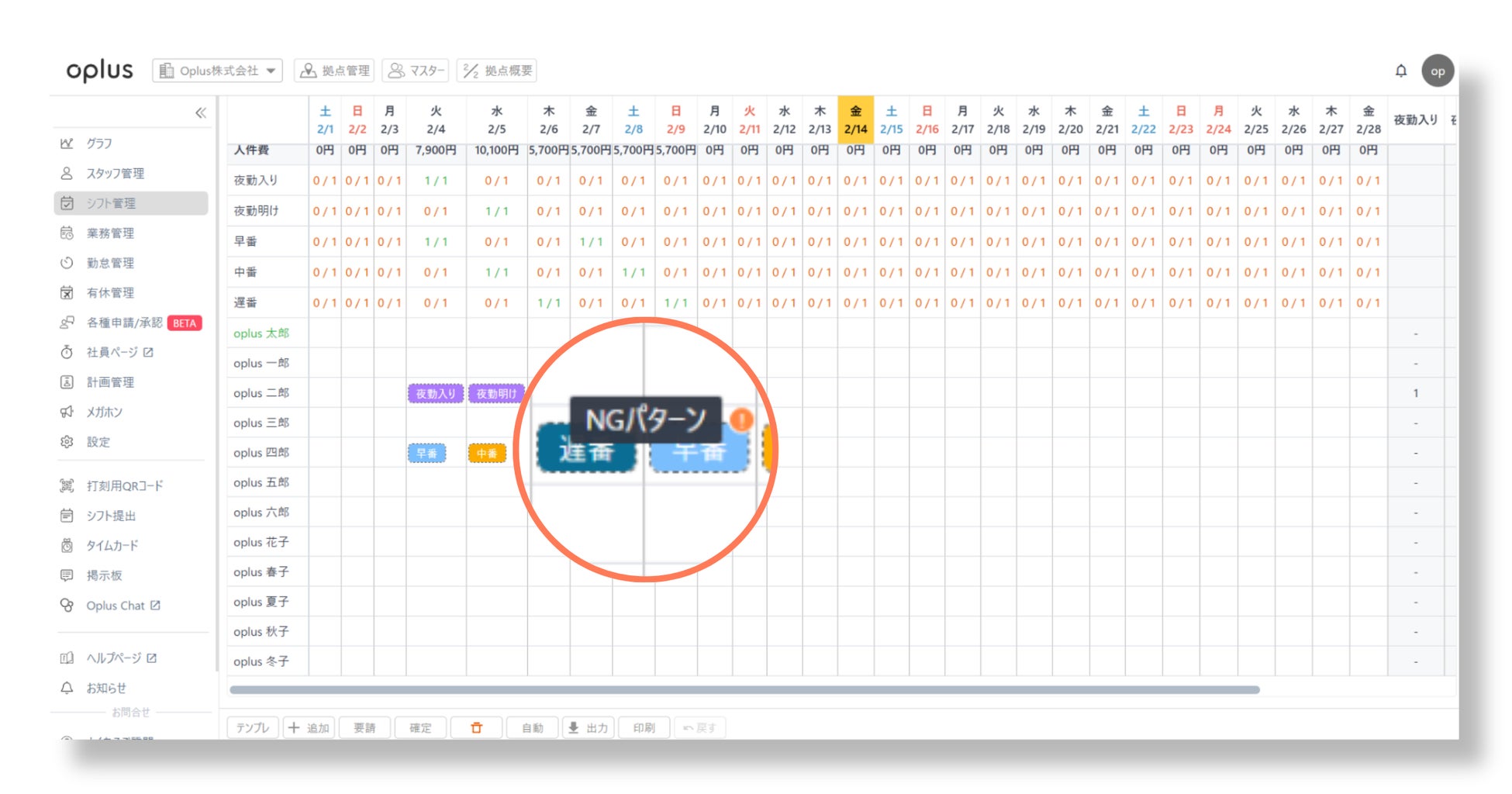 oplusの「業務パターン」「NG業務パターン」の設定で、交代制シフトの作成が大幅に効率化!
