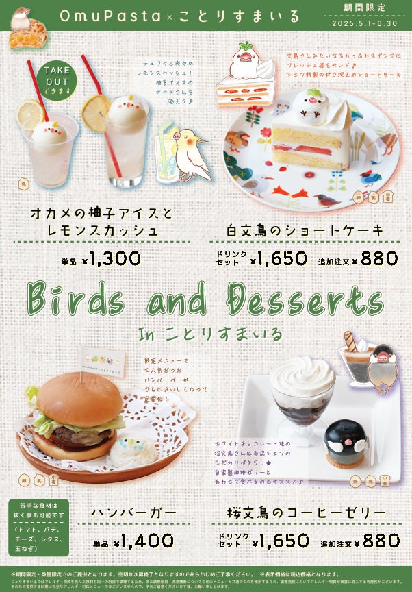 ことりすまいるにて、スイーツ好きと鳥好きさんに贈る新イベント「Birds and Desserts」が開催!人気作家 OmuPastaさん描き下ろしのイラストが限定メニューに♪♪