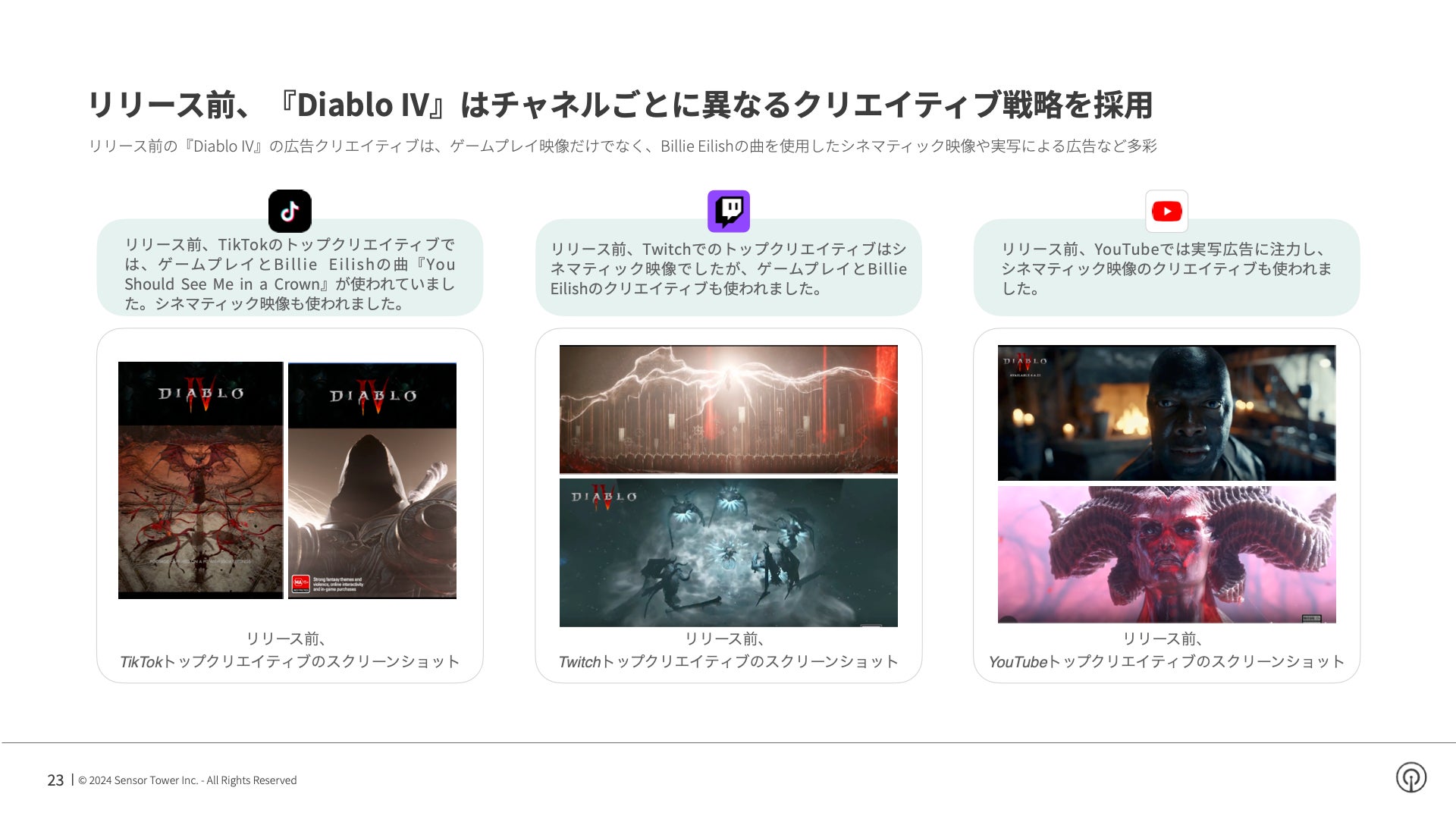 2023年第1四半期の大型リリースだった『Hogwarts Legacy』に続く、同年第2四半期の大型リリースは『Diablo IV』です。ライブサービスを考慮すると、2023年のPC/コンソールゲームの中で最大の収益を上げた可能性があります。Pathmaticsでは、『Diablo IV』のクリエイティブ戦略をチャネル別およびリリースの段階別に詳しく確認することができます。