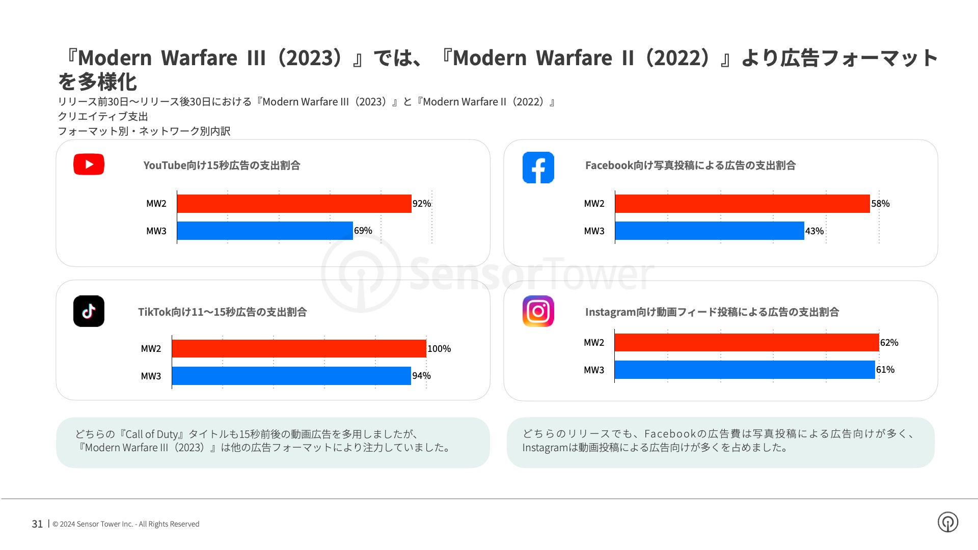 毎年リリースされる続編を比較することで、こうした動きの速いチームが得ている教訓を把握できます。たとえば、『Modern Warfare III(2023)』と『Modern Warfare II(2022)』のチャネルごとにフォーマット別広告費を比較すると、興味深い傾向が見て取れます。それは、『Modern Warfare III(2023)』の広告フォーマットが『Modern Warfare II(2022)』より多様化されたということです。これは特にYouTubeで顕著で、『Modern Warfare III(2023)』では15秒以外の長さの広告フォーマットが大幅に増加しました。『Call of Duty』チームは、広告フォーマットを多様化することに価値があると考えているようです。
