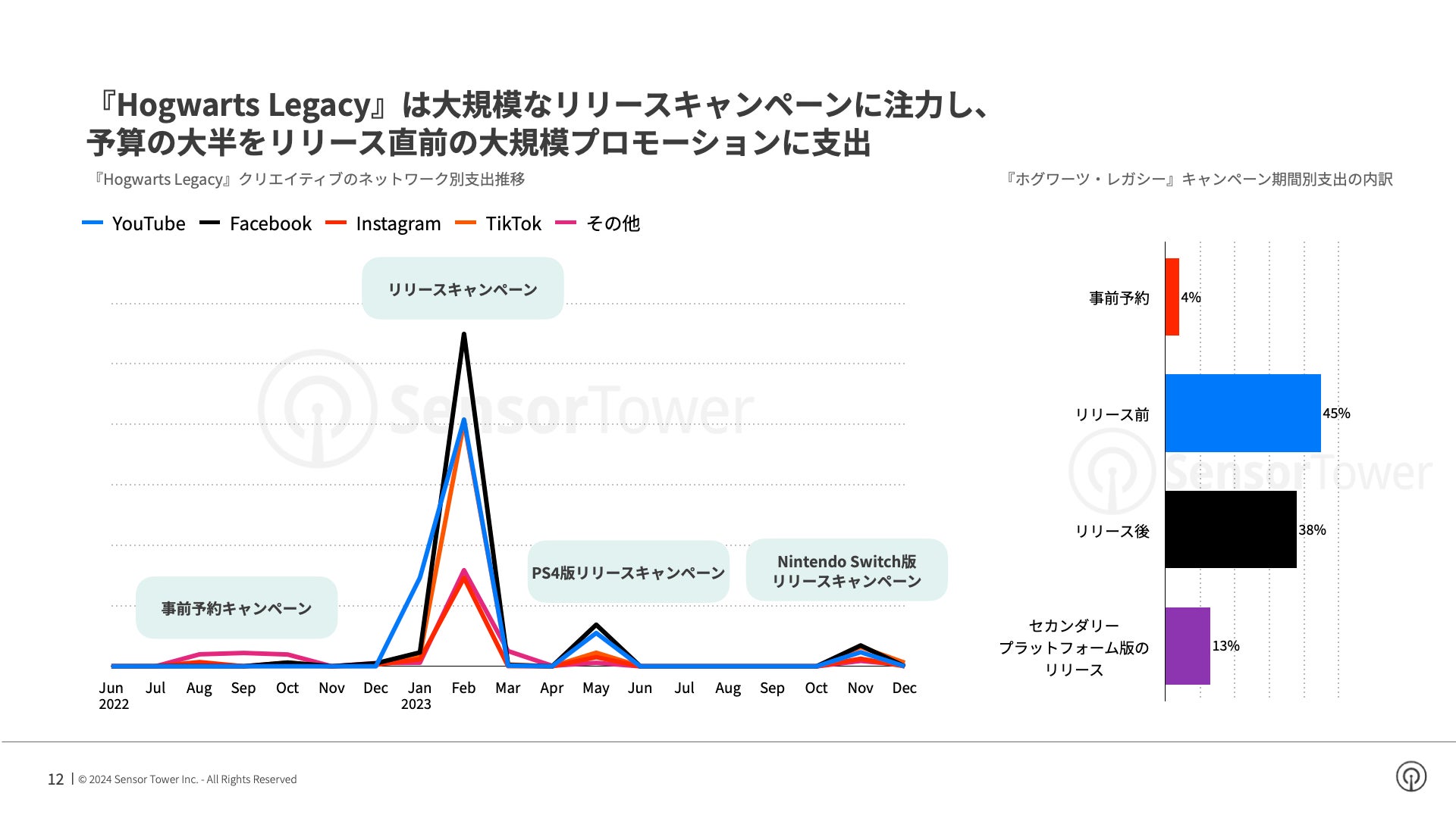 『Hogwarts Legacy』のメディアミックスに関するインサイトも得られます。Warner Bros. Gamesはリリース時、事前予約キャンペーンのときより多様なチャネルを利用し、主力のYouTubeとFacebookに加えて、ソーシャル、OTT、Twitchなどのチャネルを活用しました。