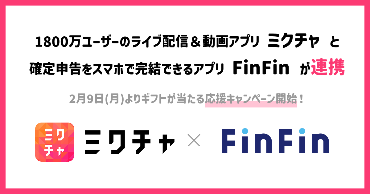 1800万ユーザーのライブ配信&動画アプリ「ミクチャ」と確定申告をスマホで完結できるアプリ「FinFin」が連携。2月9日(月)よりギフト券が当たる応援キャンペーン開始