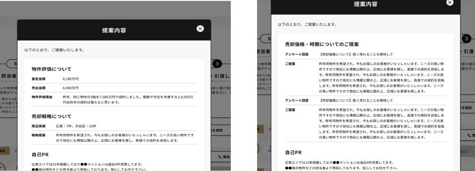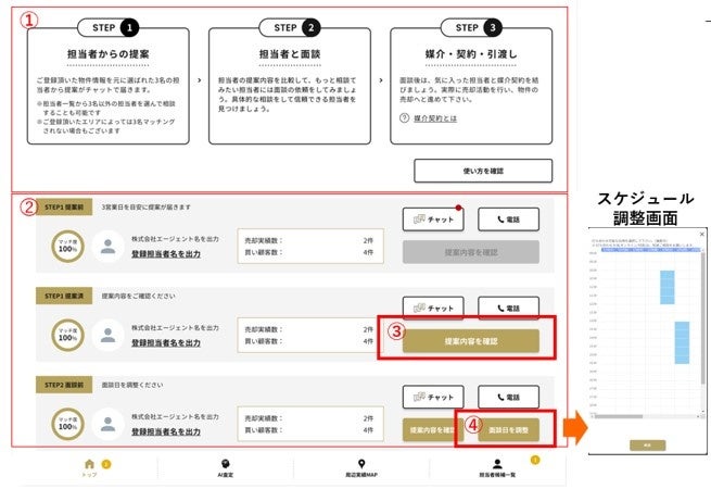 「仲介コース」のサービス内③に「提案」機能を追加。マッチングされた仲介担当者3名から、事前に回答したアンケートを基に「売却戦略」について提案を受けることができる。