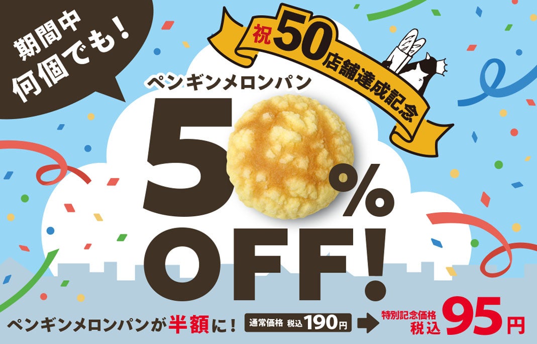 そこで、ペンギンベーカリーでは、50店舗の「50」にちなんで、自慢のメロンパンを期間中、何個でも、いつもの50%OFF(半額)でお求めいただける『ペンギンメロンパン50%OFFキャンペーン』を開催いたします。是非、この機会にペンギンベーカリーのメロンパンをお得にGETしてください!沢山のメロンパンをご用意して皆様のお越しをお待ちしております。