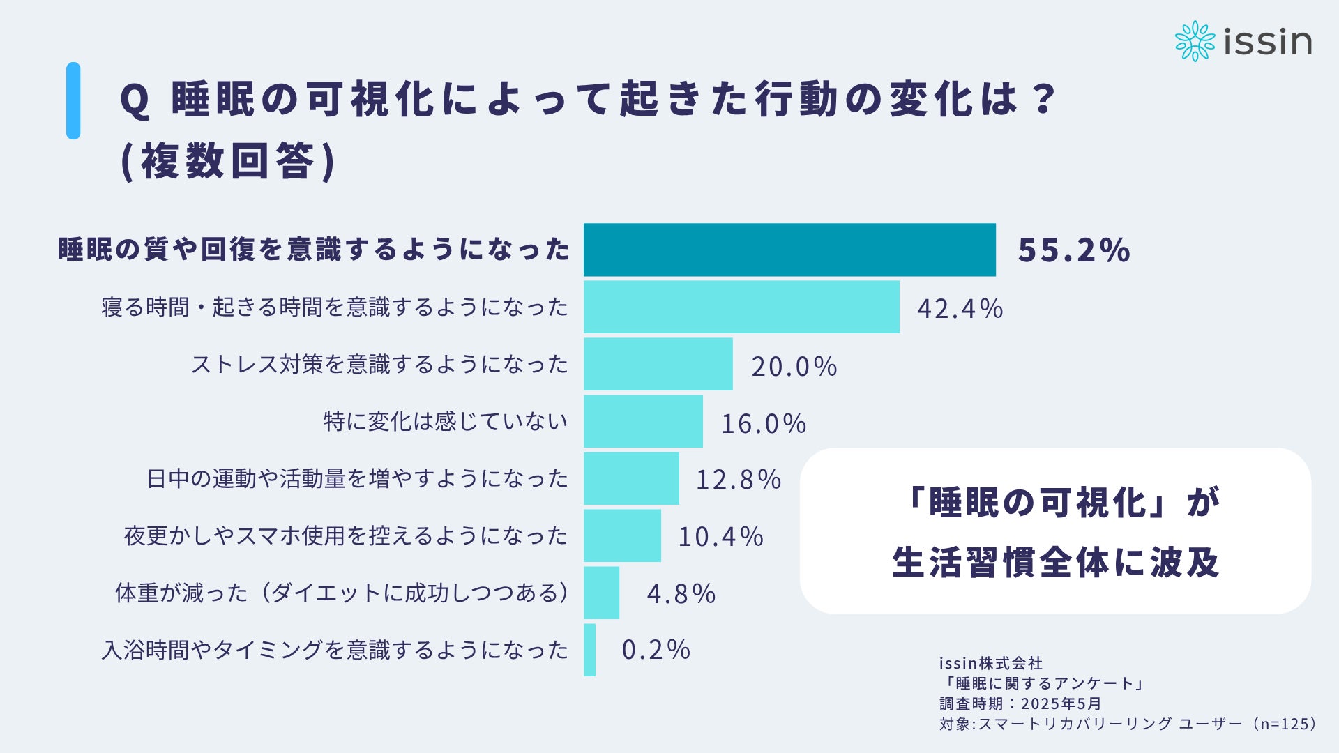 睡眠の可視化によって、意識や行動にどのような変化が起きたかを聞くと、過半数(55.2%)が「睡眠の質・回復」を意識するようになったと回答しました。さらに約4割(42.4%)が入眠・起床時間を意識するようになったことも明らかになりました。加えて、「ストレス対策」「運動量の見直し」「夜更かしの制限」などの行動変容も1〜2割程見られ、「特に変化を感じていない(16.0%)」と答えた人意外は、睡眠の可視化が生活習慣全体の何らかに波及していることがわかります。なお、少数ではあるものの、「体重が減少した」とする具体的な声も複数寄せられました。