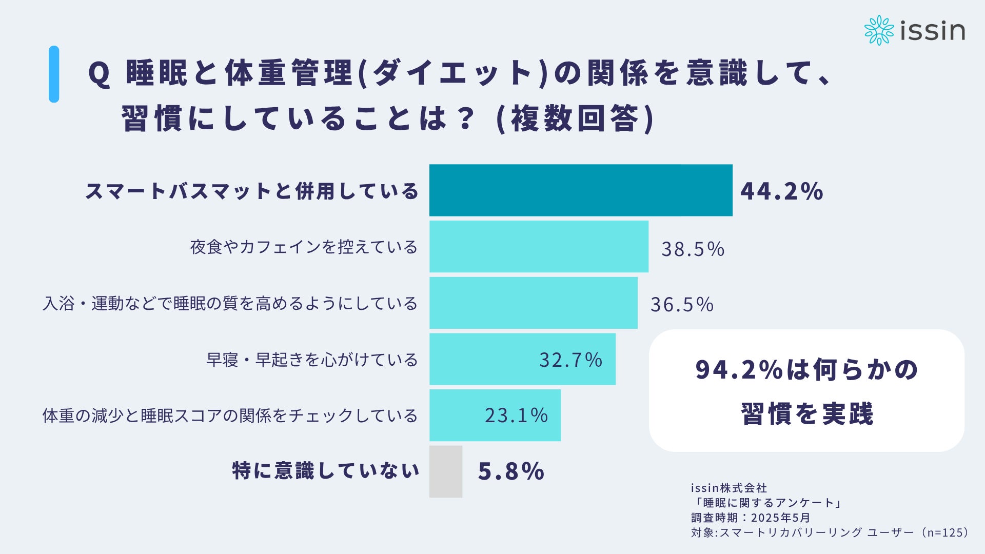一方、この関係性を理解している層では94.2%が何らかの睡眠改善につながる習慣を実践しており、理解の有無で行動に差が現れることを示唆しています。中でも「スマートバスマット」との併用者は4割以上に上り、2つのデバイスを活用して効率よく健康管理を行っていることを示しています。