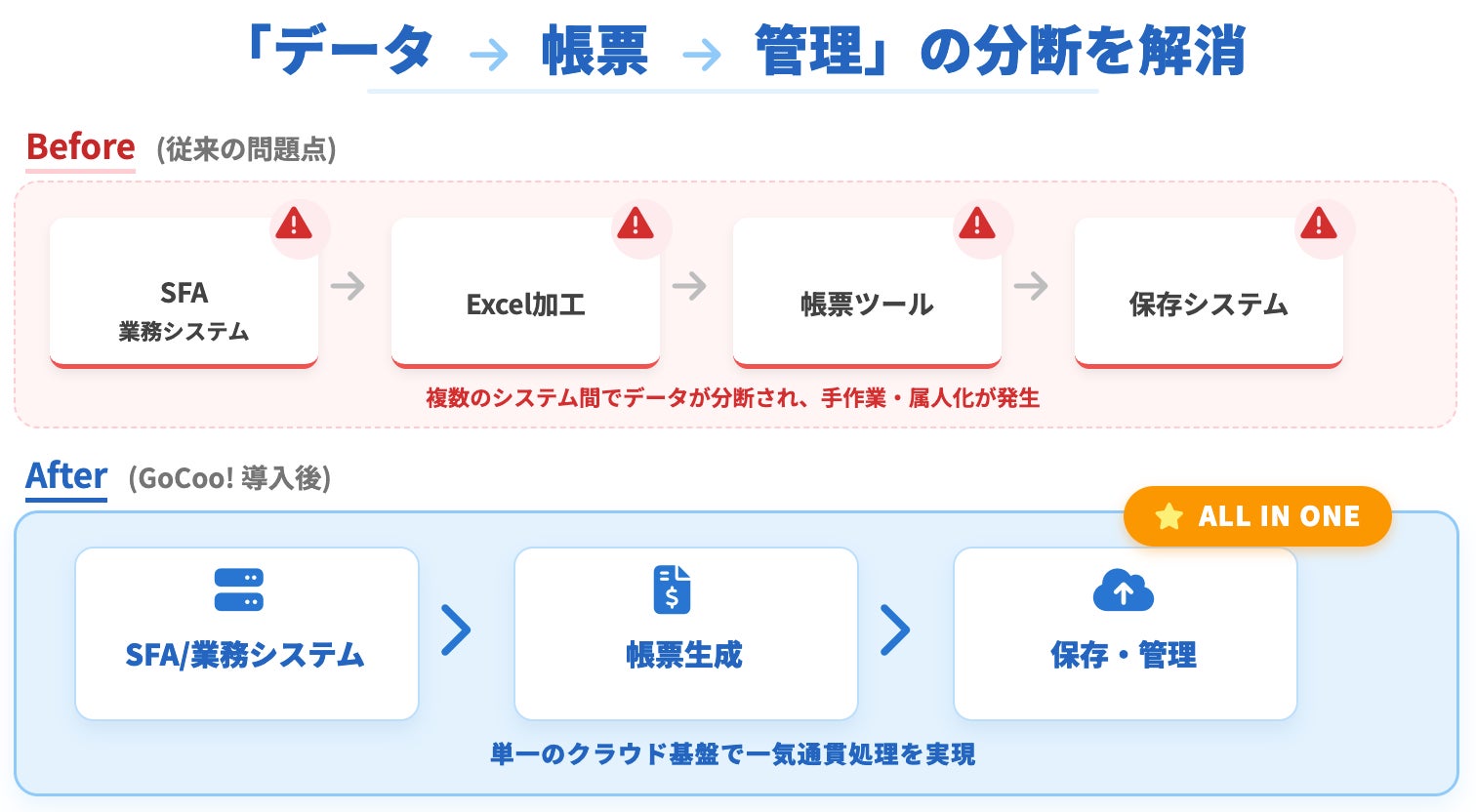 今回の機能統合により、「GoCoo! Platform」は、営業データ管理(SFA)、業務アプリ(ノーコード)、帳票機能(SVF Cloud)を一体化した業務基盤へと進化しました。これにより、業務データ管理を起点として、帳票の作成・出力・保存・管理までを一気通貫で実現し、帳票関連業務の工数削減、ヒューマンエラーの低減、業務プロセスの標準化を支援します。
