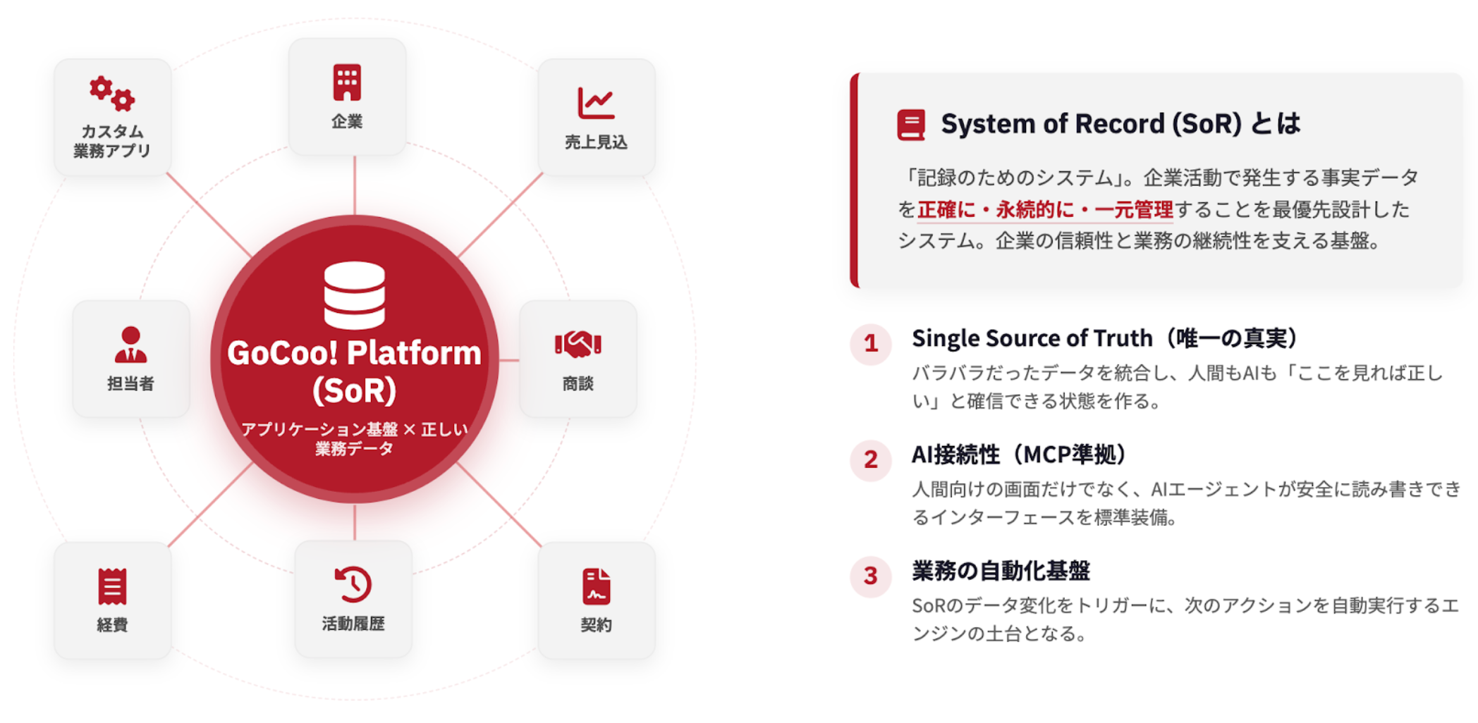 GoCoo! Platformは、従来のSFA(営業管理システム)をAI時代に対応する形へと進化させ、その本質をSystem of Record(SoR)として再定義したプロダクトです。