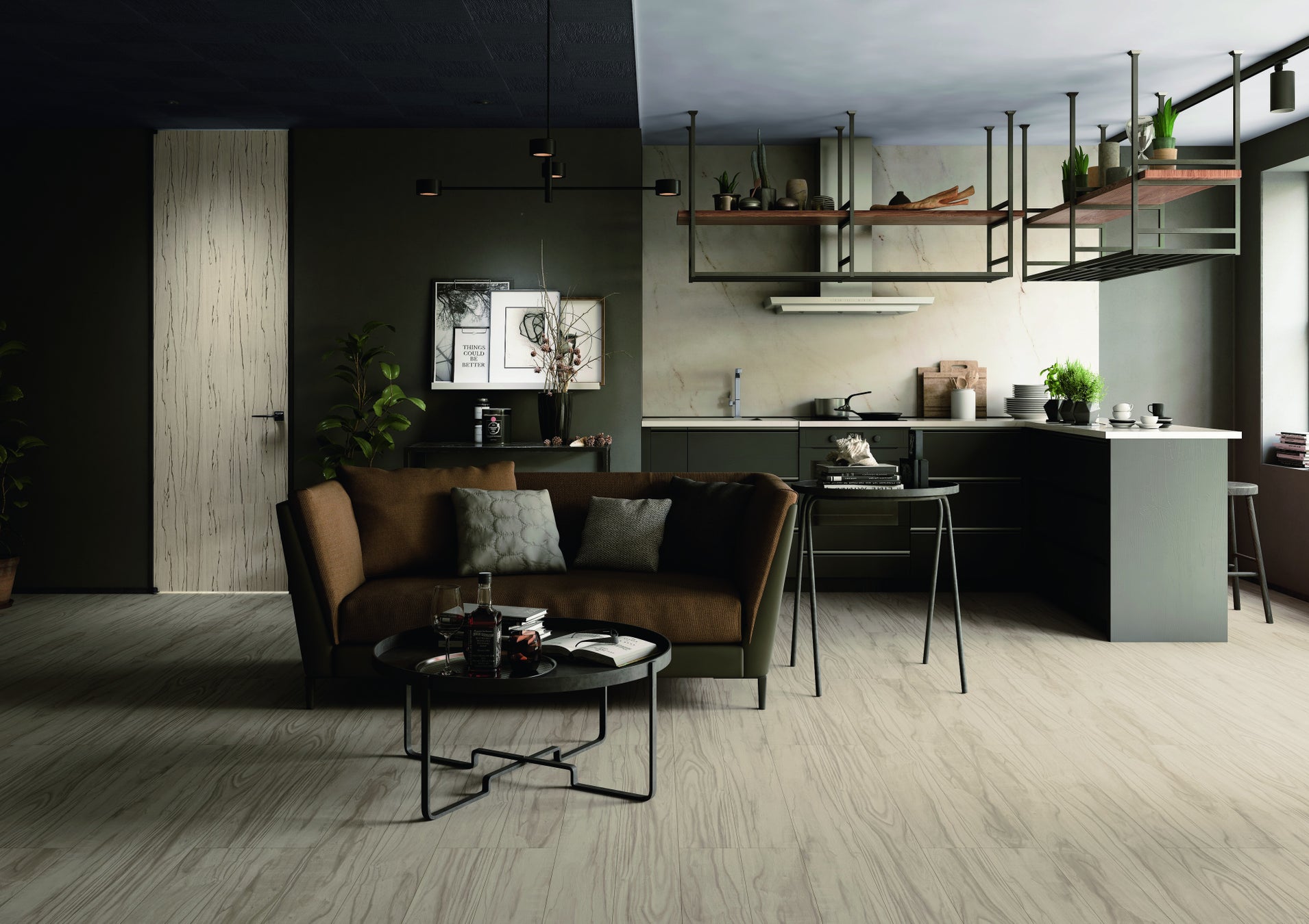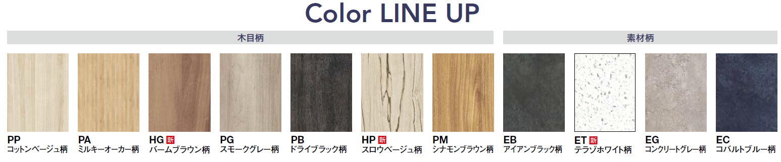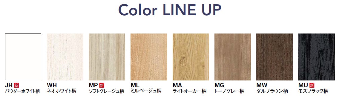 『イエリア スタンダード』には、トレンドにあわせて厳選した全8色柄をラインアップ(現『hapia』シリーズの同グレードは全9色柄)。新色として、シンプルで清潔感のある〈パウダーホワイト柄〉の他、空間にも柔らかく溶け込む〈ソフトグレージュ柄〉、立体感のある仕上げで木目の風合いが楽しめる〈モスブラック柄〉を追加しています。