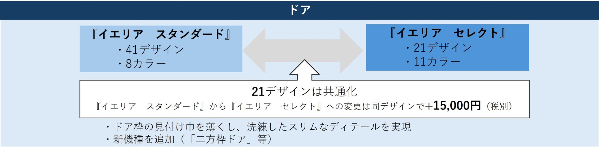 価格面においても、『イエリア スタンダード』では、これまで色柄・デザインごとに設定していた価格を、8つの価格帯に集約しました。併せて、『イエリア セレクト』は『イエリア スタンダード』の価格に15,000円(税別)をプラス(扉1枚あたり)するという、シンプルでわかりやすい価格設定としています。