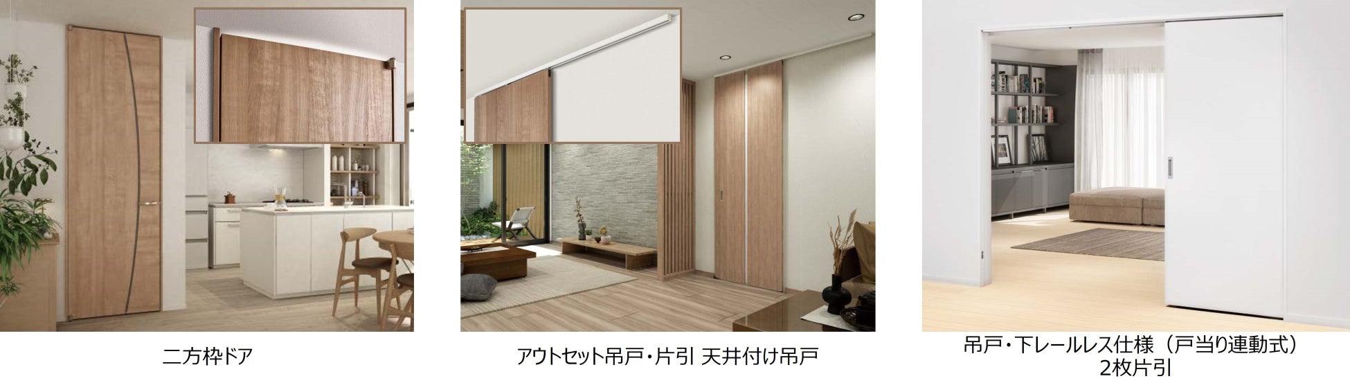 リビングに上枠レスのハイドアを採用することがトレンドになっていることから、天井高いっぱいの「二方枠ドア」(開き戸)と「アウトセット吊戸・片引 天井付け吊戸」を追加設定しました。また、下レールや床への埋込ガイドピンがなく、床面がすっきりと見える長尺開口用の「吊戸・下レールレス仕様(戸当り連動式)3枚引違/2枚片引/3枚片引」も新たに発売いたします。