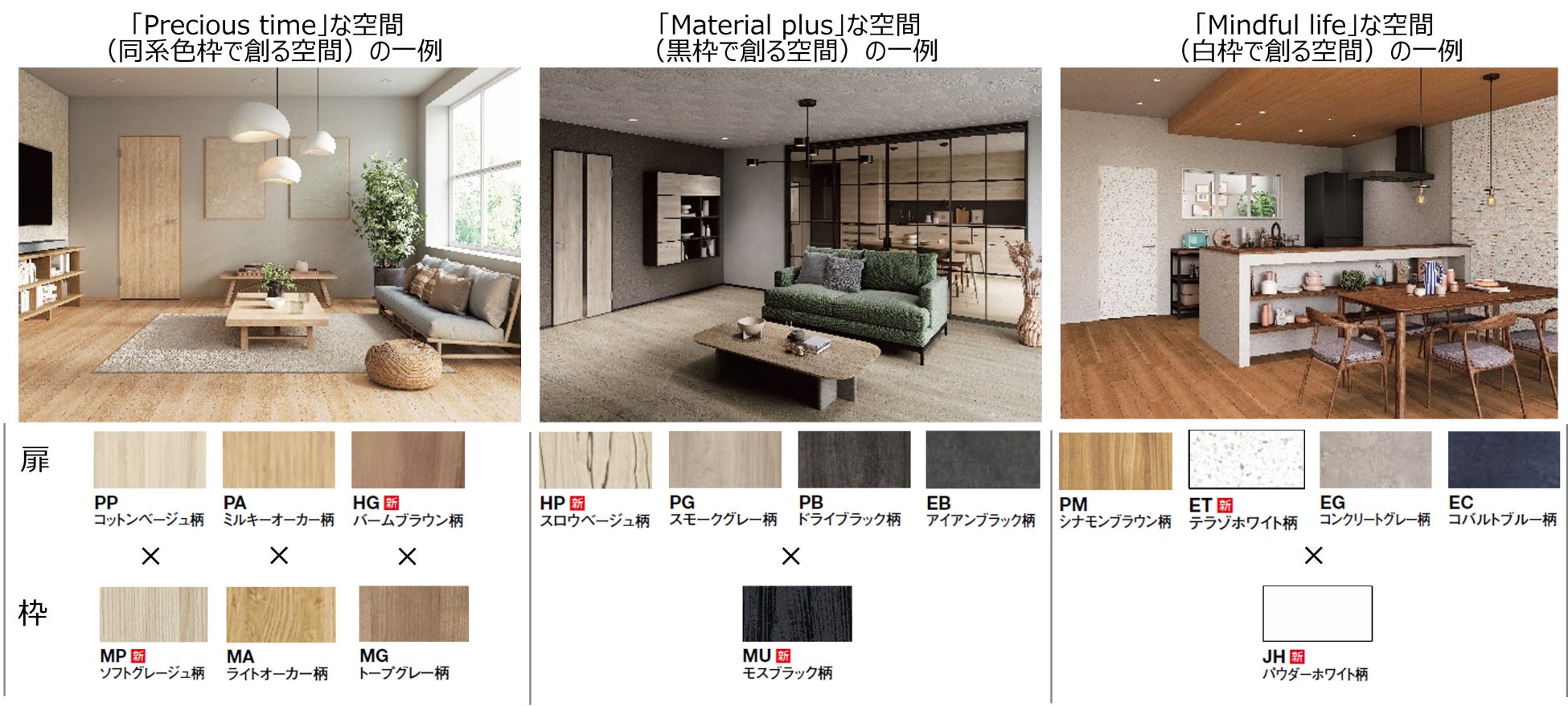 『イエリア セレクト』では、インパクトのある木目が魅力の〈バームブラウン柄〉、〈スロウベージュ柄〉、テラゾーの深みのある自然な素材感が特長の〈テラゾホワイト柄〉の3つの新色を追加し、全11色柄をラインアップしています(現『hapia』シリーズの同グレードは全14色柄)。なお、ドア枠の色柄については、両グレードともに、『スタンダード』の8柄の中からお選びいただきます。