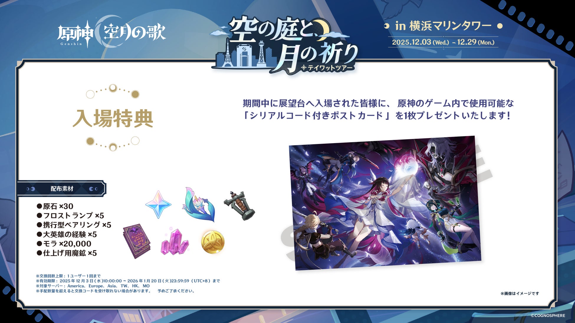 期間中に展望フロア入場券を購入された皆様に、『原神』のゲーム内で使用可能な【シリアルコード付きポストカード】を1枚プレゼント!