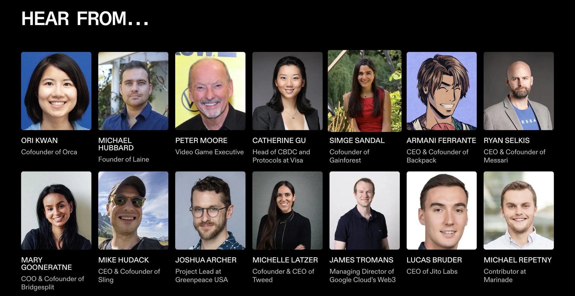 豪華スピーカー陣が Google Cloud、Visa、Star Atlas、Messari などから参加し、AI と DeFi の交差点、暗号規制のコンプライアンス、リアルワールドアセット(RWA)のオンチェーン化など多岐にわたるトピックについてのパネルが開催されます。