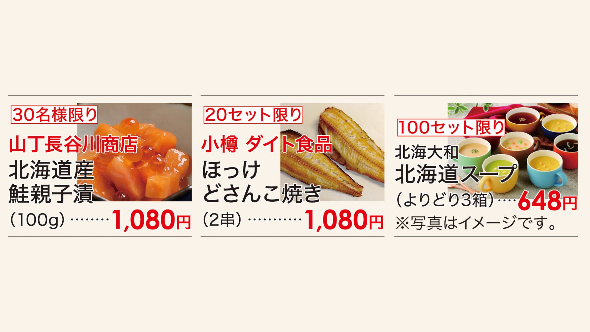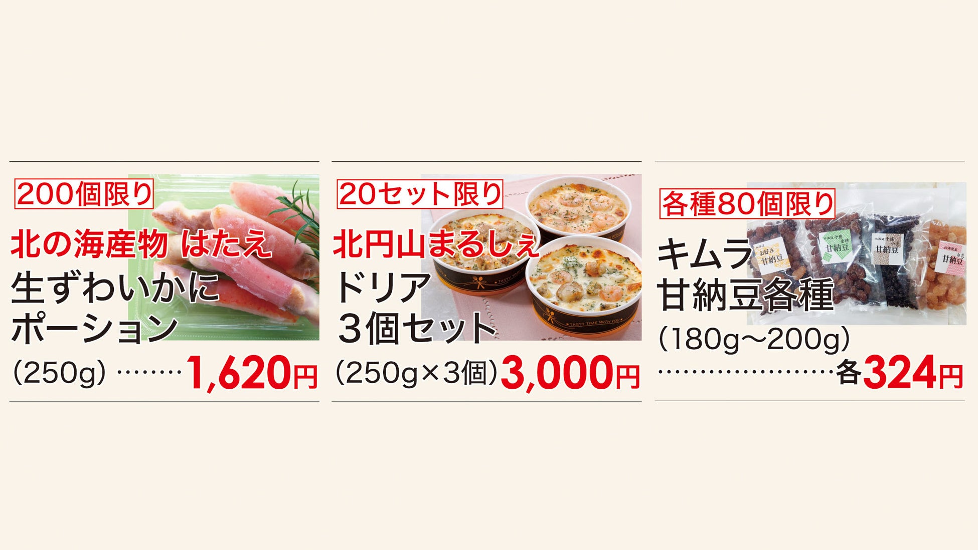 今年も札幌、小樽、函館、旭川など北海道各地の名店から届く海産物、スイーツ、惣菜、乳製品など、バラエティに富んだ北の味覚をご堪能いただけます。特に注目は豪快な海の幸や山の幸を使った「贅沢弁当」。北海道産牛一頭食いステーキ弁当や蟹工船爪詰め合わせ弁当、半生うに&炙りうに食べ比べなど、北海道の豊かさを感じられる逸品ばかりです。そして毎日変わる「数量限定日替り奉仕品」や「数量限定日替り弁当」も見逃せません。期間中の特別奉仕品も多数ご用意し、北海道の美味をお楽しみいただけます。