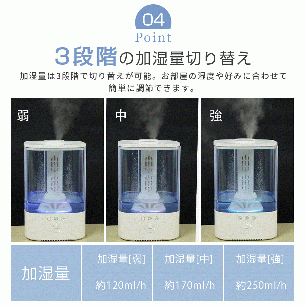 超音波式でミストが熱くならないので、子供やペットがいるご家族も安心して使えます。タッチ操作で、ミスト量は弱・中・強の3段階で調節可能で、部屋の大きさや季節などに応じて選択できます。