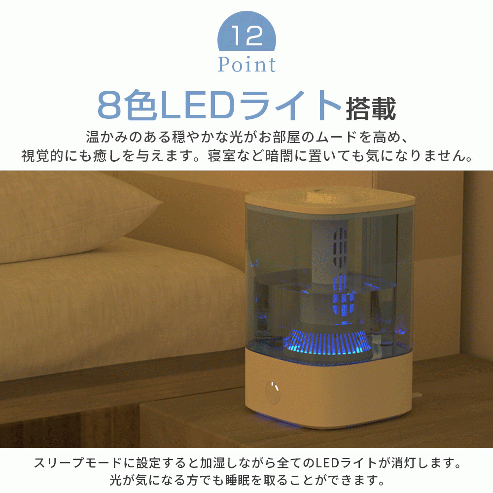 就寝時に適した環境を整え、過剰に加湿しすぎてしまわないように、2・4・8Hタイマー機能が備わっています。加湿量ボタンを長押すと、睡眠モードがオンになります。消灯し(電源ランプのみ表示)、加湿量が弱モードで運転します。また、消し忘れて稼働中に水がなくなった場合は、自動で止まるのも安心です。