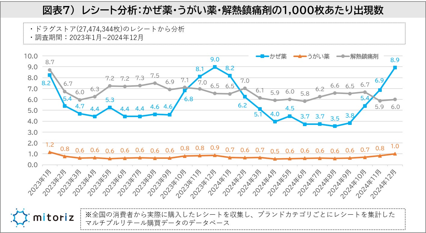 POB会員が投稿したレシートデータから2023年と2024年にドラッグストアで購入された「かぜ薬」「うがい薬」「解熱鎮痛剤」の1,000枚あたりの出現数を分析しました。「かぜ薬」は2023年、2024年とも気温が下がり始める10月頃から数値が上昇しており、どちらの年も12月が最も高い数値を示しています。一方で「解熱鎮痛剤」は2023年1月の数値は高く出ているものの、年間を通してそこまで大きな変動は見られず、「うがい薬」は更に変動が少なく出ています。どちらも年間を通して安定して購入されていることが考えられます(図表7)。