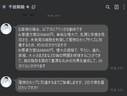 LINE追加後に、健康食品を販売するところ、摂取するだけで、乳腺細胞が増え、豊胸効果が得られる旨説明し、摂取前後の、バストの画像を用いて効果を訴求し、勧誘したことが確認されました。