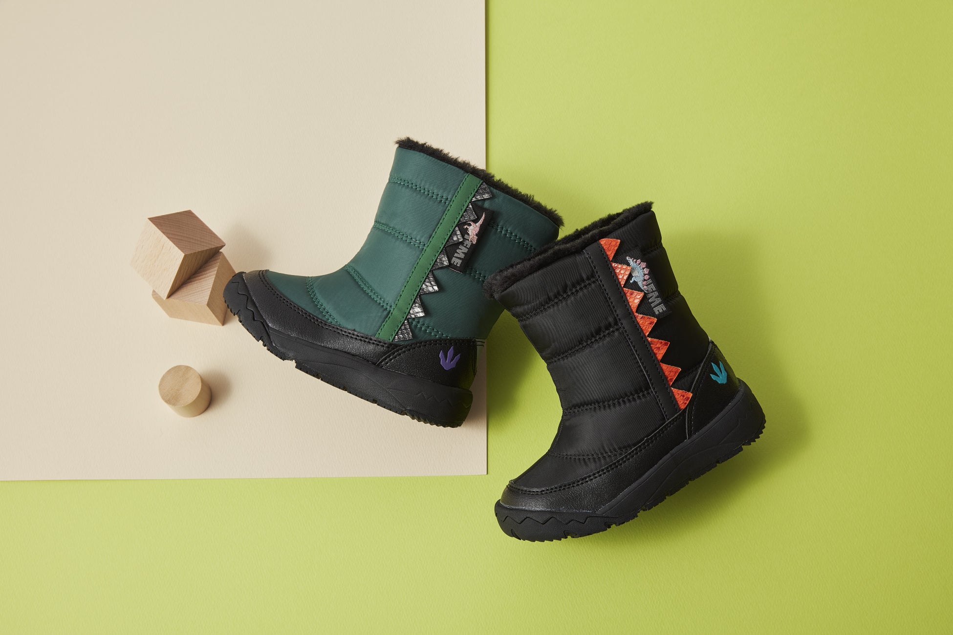 スッキリとしたフォルムが特徴的なノーベルトのブーツが新登場。ベルトがないため、小さなお子様でも脱ぎ履きが簡単。新型アウトソールを採用し、機能性も備えました。カラーは、ブラック・ブルー・パープル・イエローの全4色を展開。さらに、キッズサイズ向けには「IFME 恐竜くんミドルブーツ」を発売します。グリーンとブラックの全2色で、サイドには恐竜の背中をモチーフにした、かわいらしいギザギザをデザインしました。恐竜好きのお子様にはたまらないアイテムです。