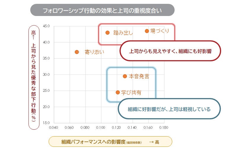 組織成果にプラスの一部フォロワーシップ行動は、上司に見過ごされやすい実態(右図)