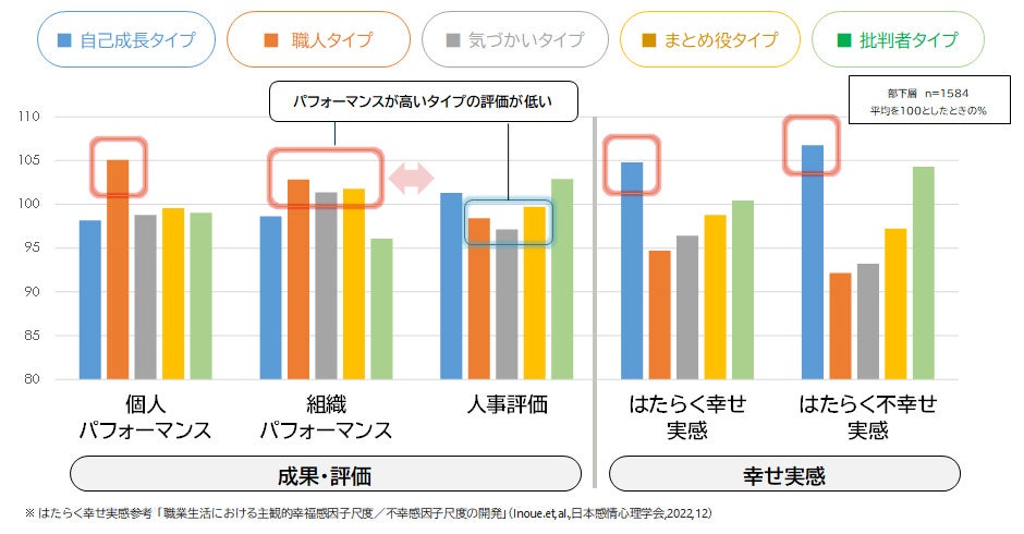 フォロワーのタイプ別成果・評価と幸せ実感:フォロワーのタイプ別に各種成果指標の違いを見た。組織パフォーマンスが高い「「職人」「気づかい」「まとめ役」タイプは人事評価が低めで、組織パフォーマンスが低めの「自己成長」「批判者」タイプは人事評価が高いという逆転した関係がみられる。