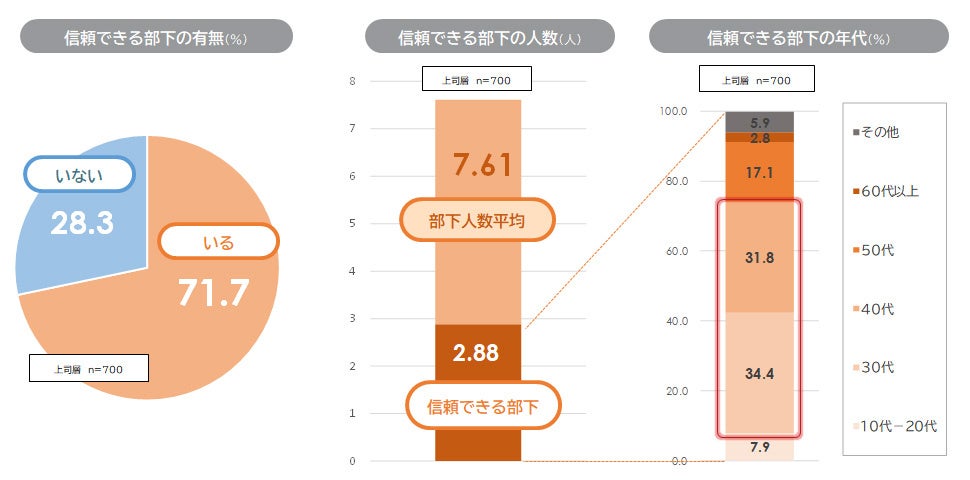 5. 71.7%の上司層が職場に「信頼できる優秀な部下」がいると回答:信頼できる部下の人数は平均で2.88人。年代では、30₋40代の部下を挙げる上司が多い。