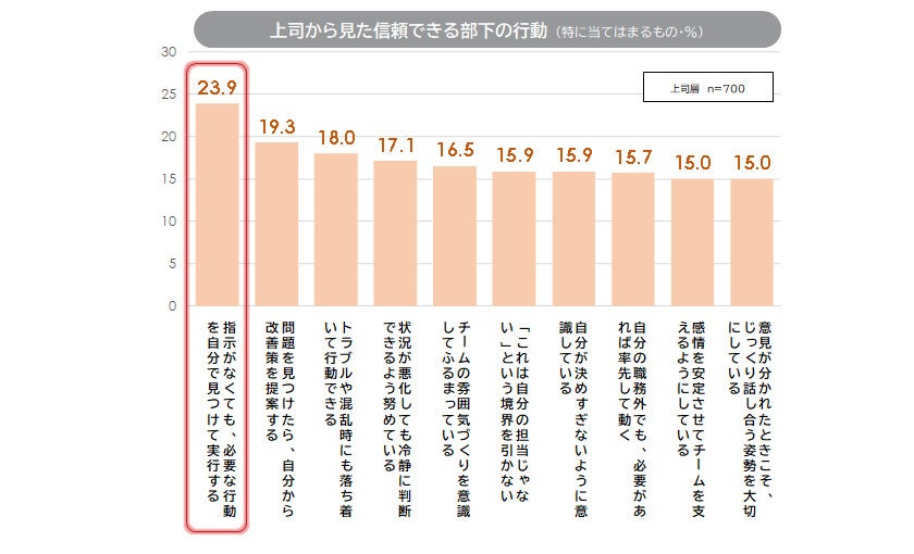 6. 上司が重視する行動と、組織に効く行動にはズレがある:上司から見た信頼できる部下(フォロワー)の行動を聴取した。「指示がなくても、必要な行動を自分で見つけて実行する」が最上位。以下、「問題を見つけたら、自分から改善策を提案する」「トラブルや混乱時にも落ち着いて行動できる」が続く。上司層は、主にフォロワーの先回り行動と冷静な業務判断を重視している傾向がみられる。