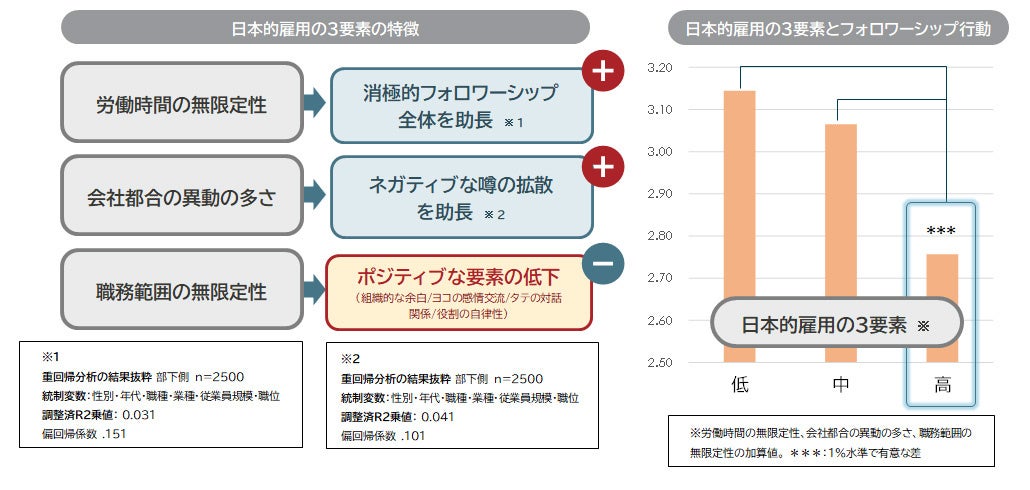「労働時間の無限定性」「会社都合の異動の多さ」「職務範囲の無限定性」という、いわゆる日本的な雇用習慣がフォロワーシップ行動を縮小させていることが示された。