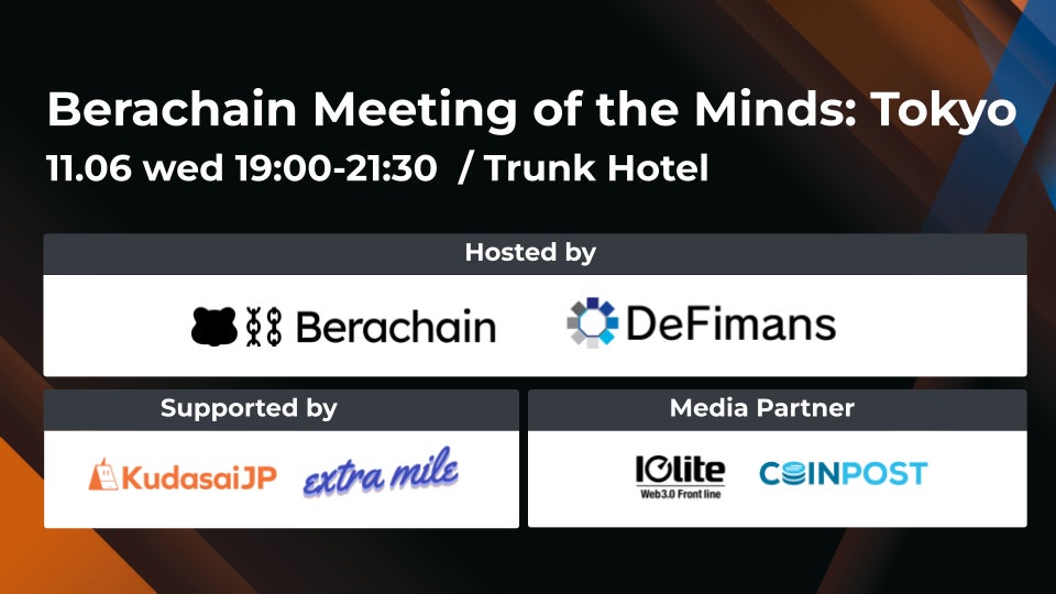 株式会社DeFimans(所在地:東京都港区、代表取締役:小野 暢思・佐藤 太思、以下「DeFimans」)は、Berachainと共同で、2024年11月6日(水)に「Berachain Meeting of the Minds: Tokyo」を開催しました。