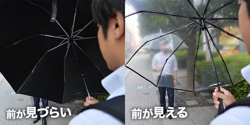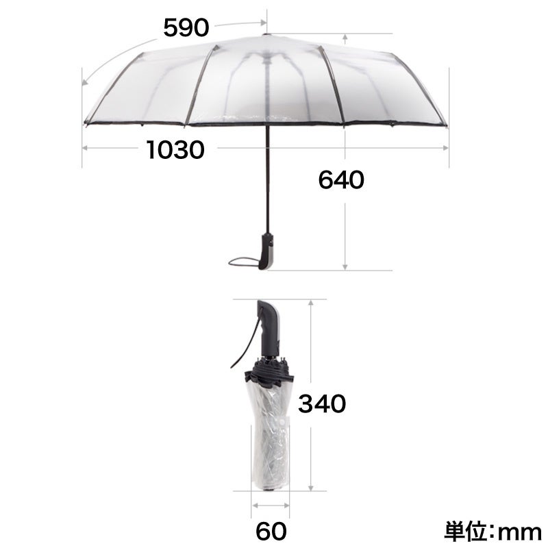 ビニール素材を採用し、傘をさしていても前が確認できて安全に使うことができます。親骨60cm。手元のボタンで簡単に開け閉めができる自動開閉式。10本の親骨と傘の縁に縫製を施し壊れにくい構造を採用。